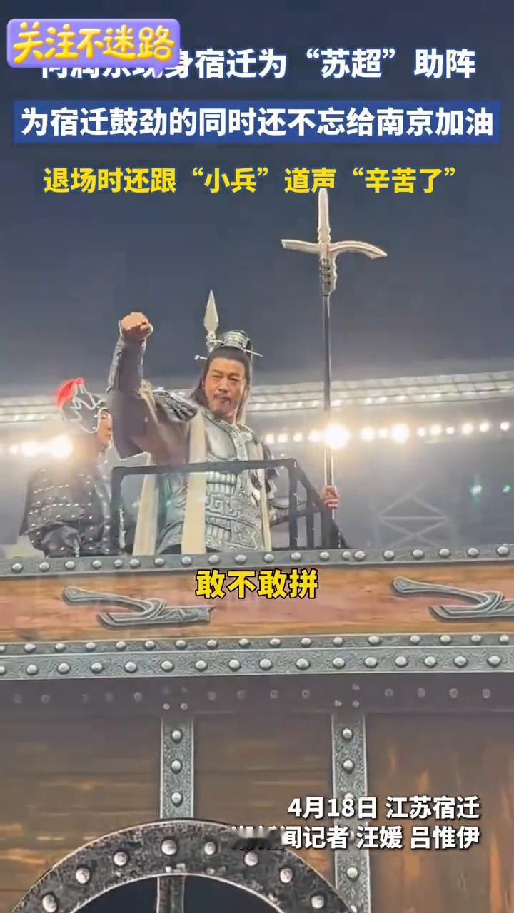 身宿迁为"苏超"助阵,为宿迁鼓劲的同时还不忘给南京加油,退场时还跟"小兵"道声"