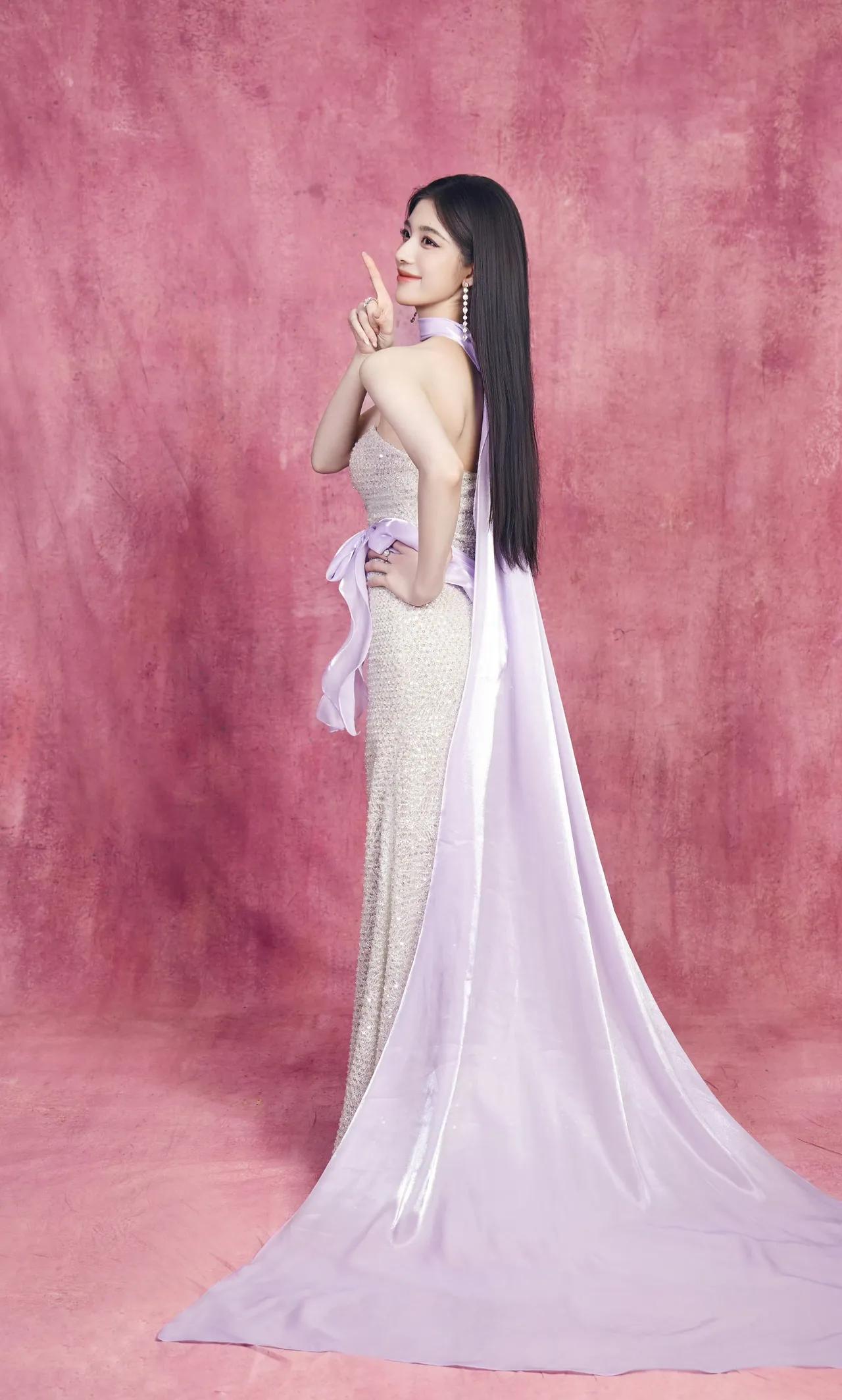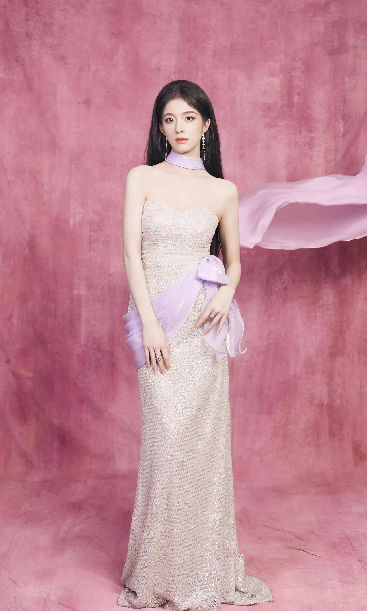 美女壁纸~钟丽丽,银白亮片礼裙缀满细碎星光,淡紫缎带如柔风轻拂颈间,在粉调背景里