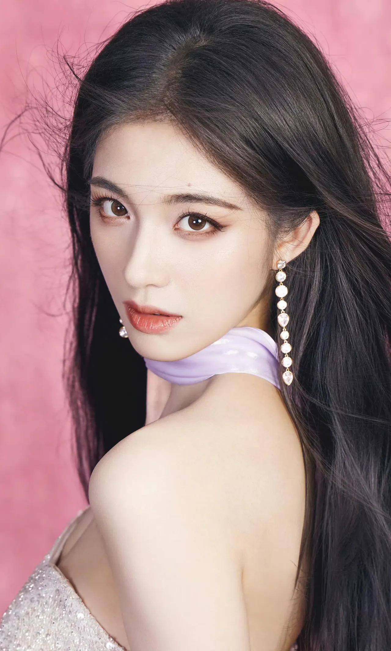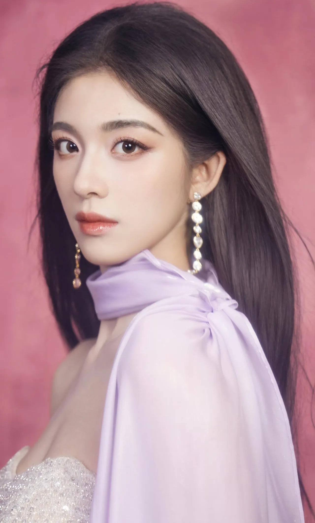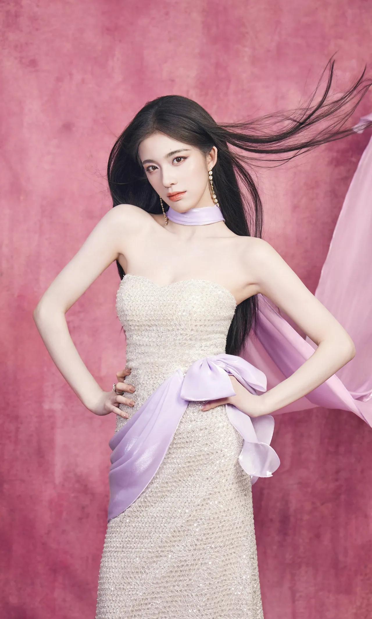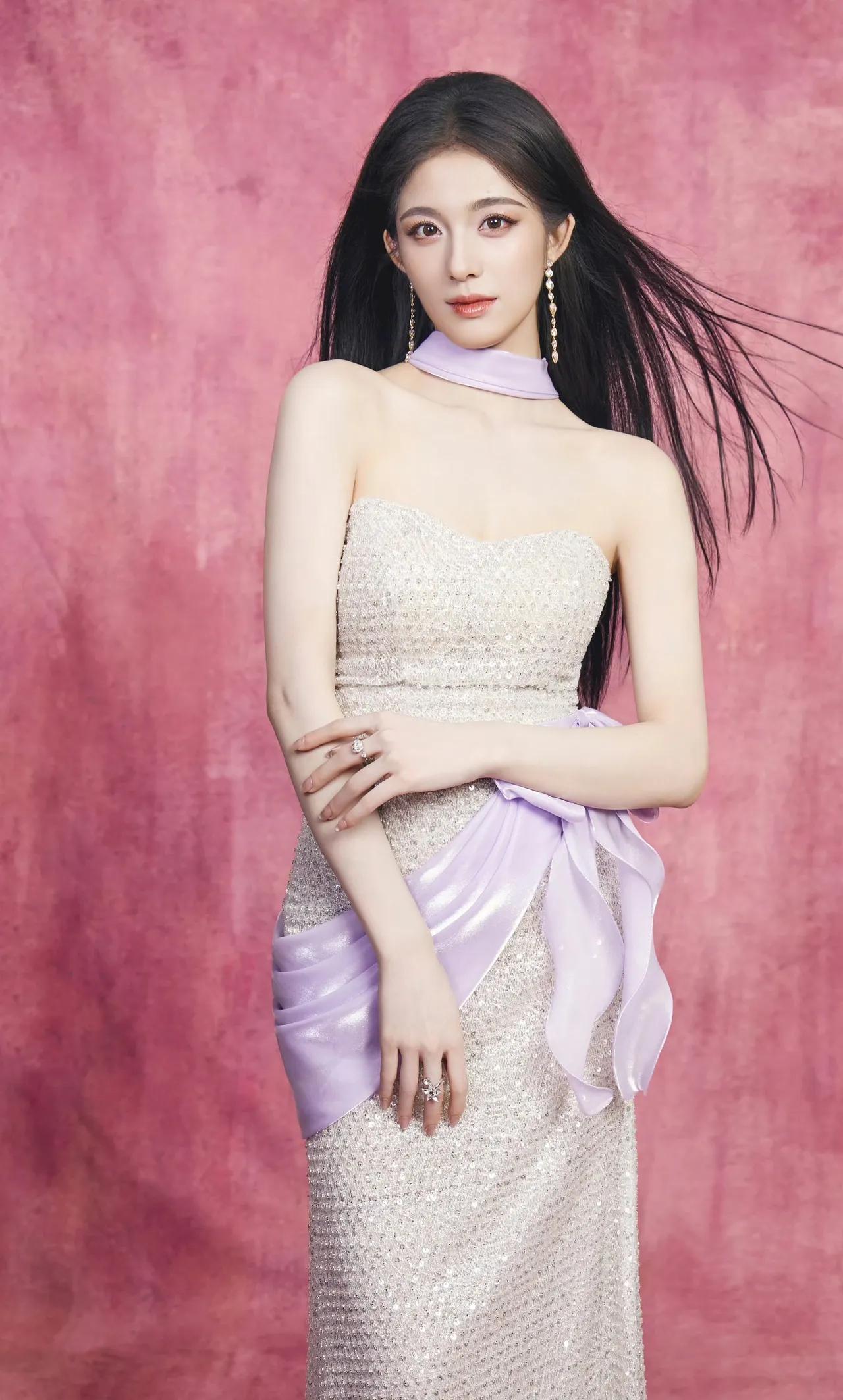 美女壁纸~钟丽丽,银白亮片礼裙缀满细碎星光,淡紫缎带如柔风轻拂颈间,在粉调背景里漾开朦胧温柔