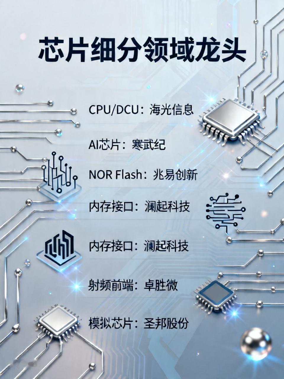 芯片细分领域龙头不少。芯片设计方面,海光信息是国产CPU/DCU龙头,深度绑定国内AI服务器厂商;寒武纪是AI芯片龙头,云端AI芯片国内领先;兆易创新是NOR Flash存储芯片龙头,全球排第二。澜起科技是内存接口芯片龙头,全球DDR5内存接口芯片市占率第一。卓胜微是射频前端芯片龙头,圣邦股份是模拟芯片龙头。