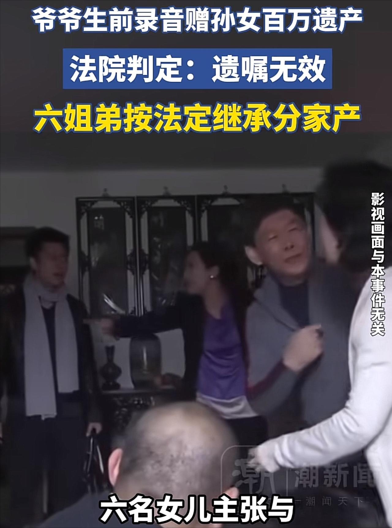 6个姐妹表示,老父亲的109万遗产是全家共同财产,应该由兄妹七人平均分割,每个人都有份,不能让男子一个人独占。男子当场拿出遗嘱,反驳说父亲已经明确将遗产赠与孙女,她们没有权利争抢,而且父亲生病期间,她们从未尽过赡养义务,根本没资格分遗产。