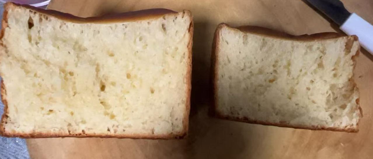 一直没有买厨师机,手工操作是自己的最爱,但是这次却忘记了时间的力量,时间是烘培的朋友也是敌人,心急吃不了热豆腐,如果时间不足,它就会给你脸色看了,初步估计是留给面团水合的时间太短,面团没有很好的起筋,遇事不决问AI,AI给出的原因不少,其中一条应该是这次失败的源头:土司需要强力的面筋支撑气体。若面团未达到完全扩展阶段(手套膜),面筋网络无法锁住发酵产生的二氧化碳,导致面团塌陷或长不高。