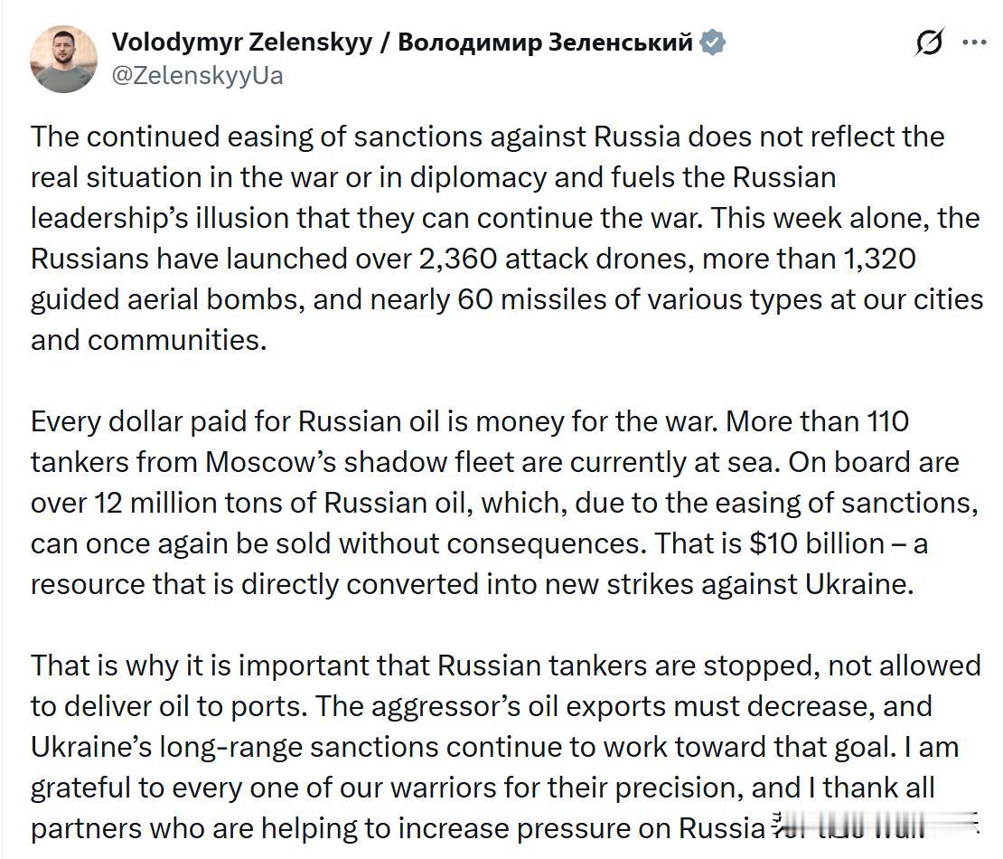 据外媒报道当地时间19日,乌克兰总统泽连斯基在X平台发文猛烈抨击美方关于暂时放松对俄石油制裁的措施。