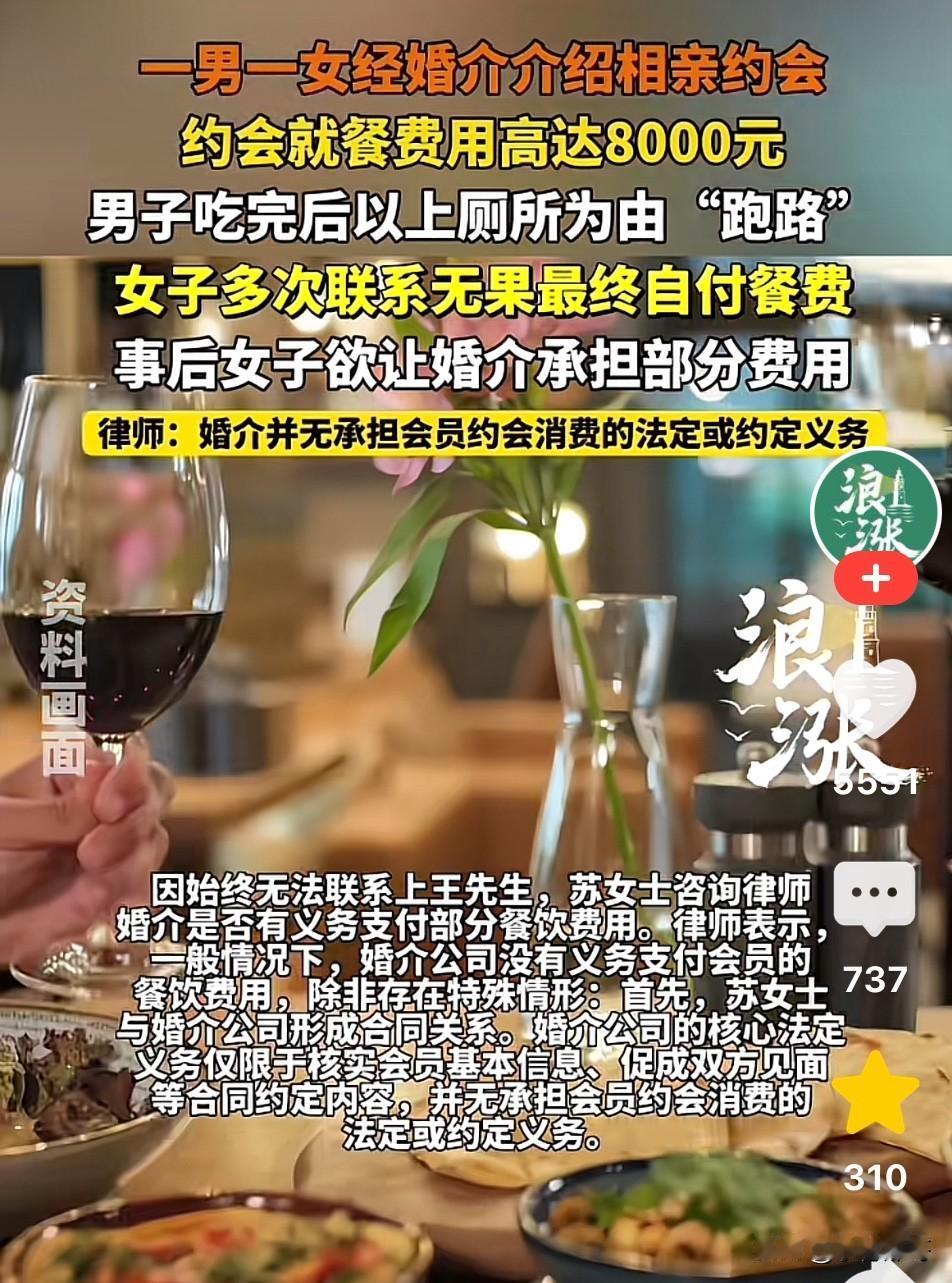 女子与男子约会点了8000元的饭菜,中途男子谎称上厕所后跑路,女子多次联系无果,自己买了单。女子事后觉得自己太冤大头了,就找到婚介网站。