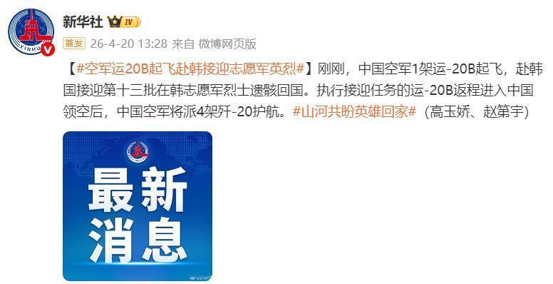 4月20日,据央视新闻直播间报道,今天下午1点30分,中国🇨🇳空军1架运一20B运输机从华中某机场起飞,执行赴韩国接迎第13批在韩国志愿军烈士遗骸回国任务。