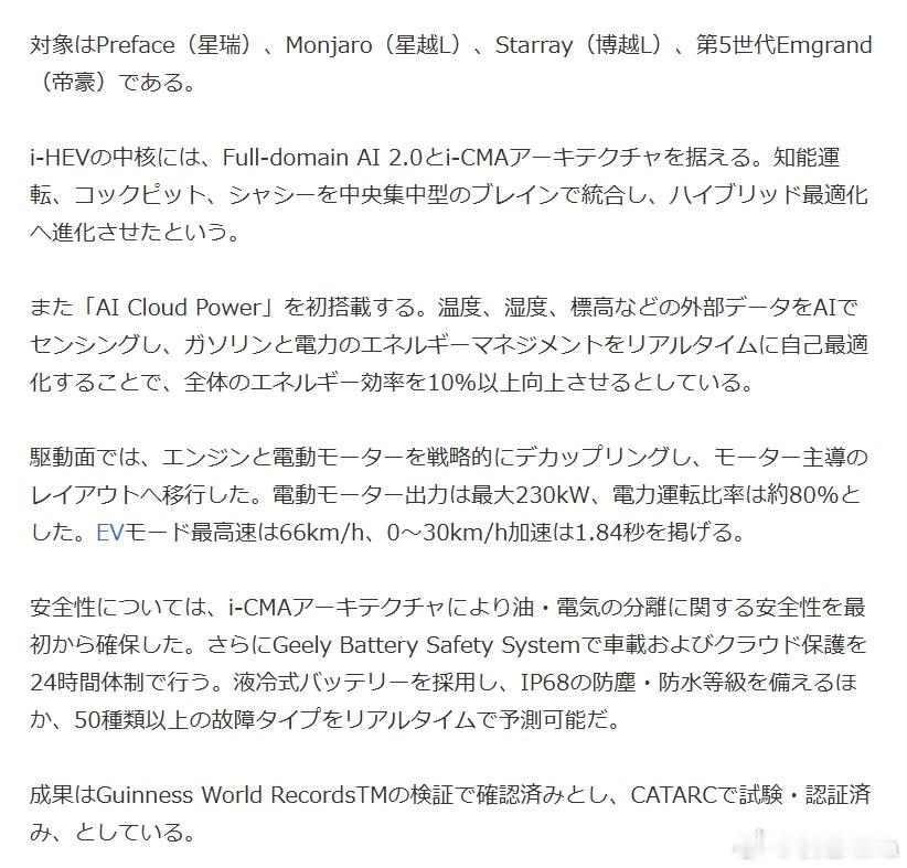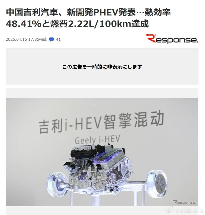 日本媒体报道了吉利百公里2.2升油耗的i-HEV混动技术,正文内容偏中立。我们看