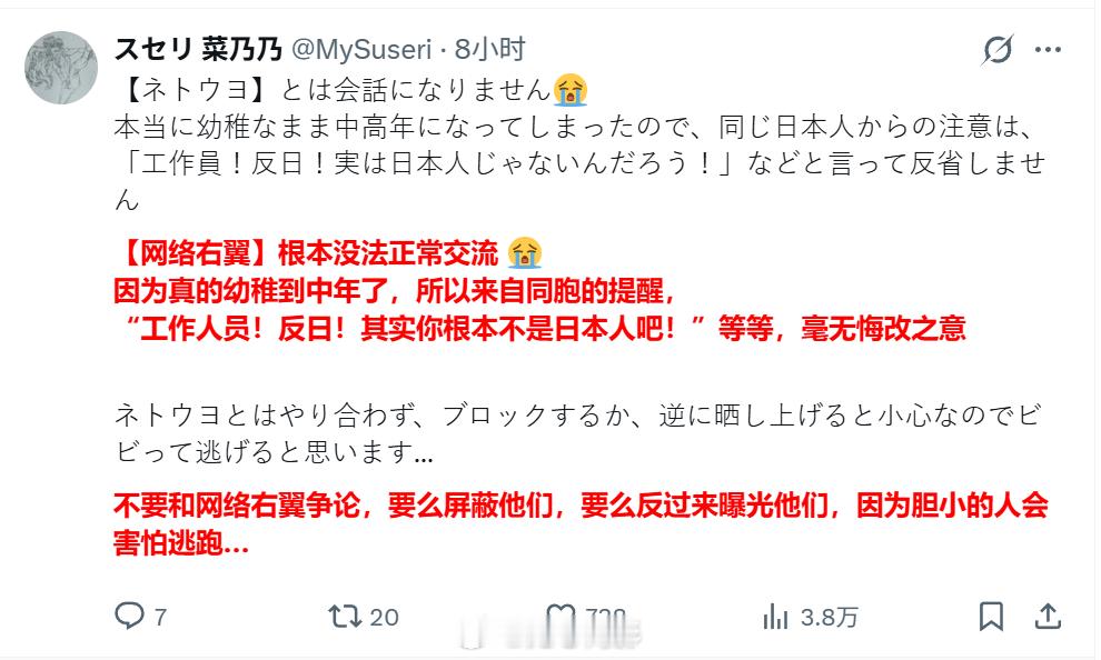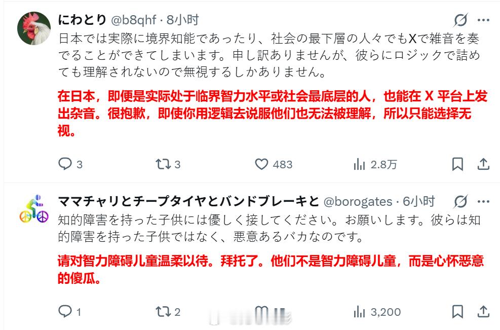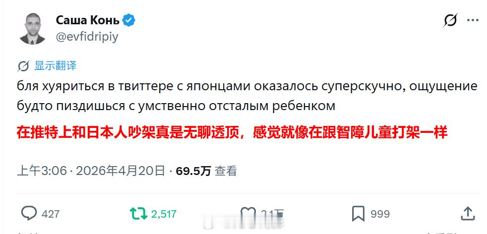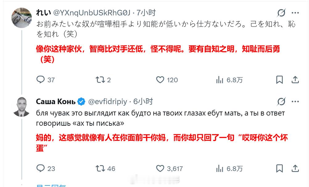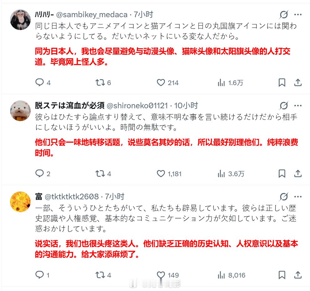 一个俄罗斯博主对日本人的看法,以及不同日本人的反应。事件的背景是,马斯克最近给推特都加上自动翻译,并让各国内容互通之后,跨国之间的网友能更多看到其他国家的帖子了。于是,日本人的本性被更真实的暴露在全世界眼前,特别是那群沙币右翼,向所有人展示了日本人的阴湿面貌。