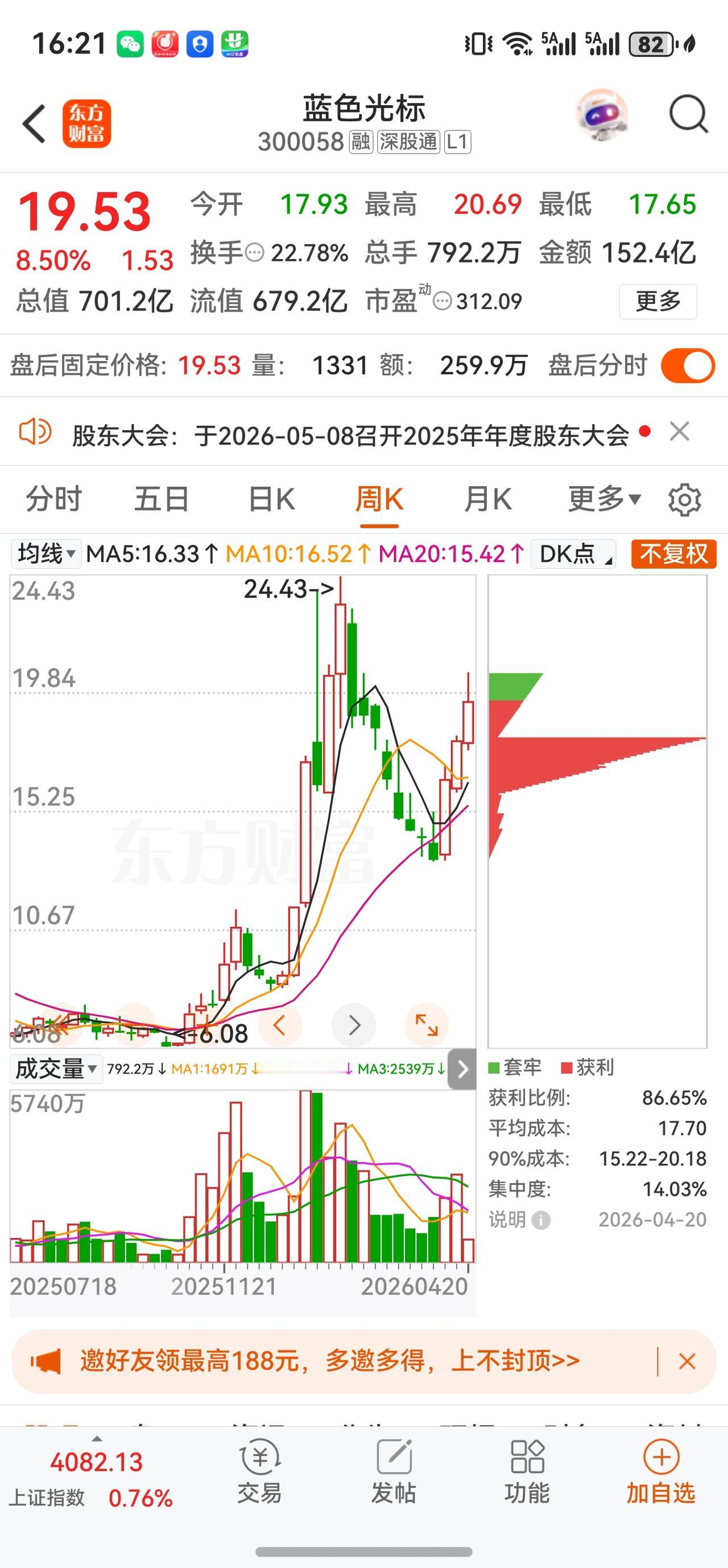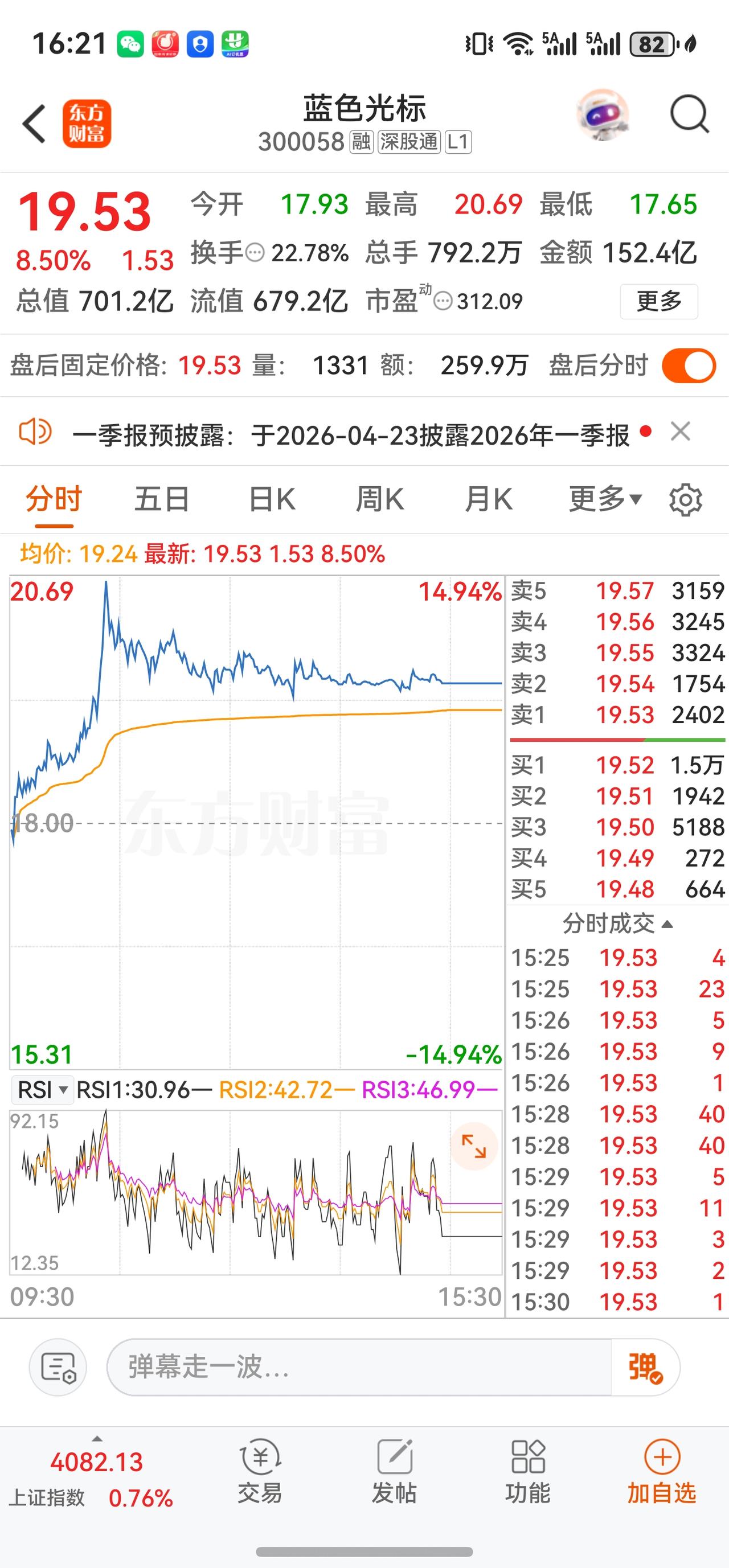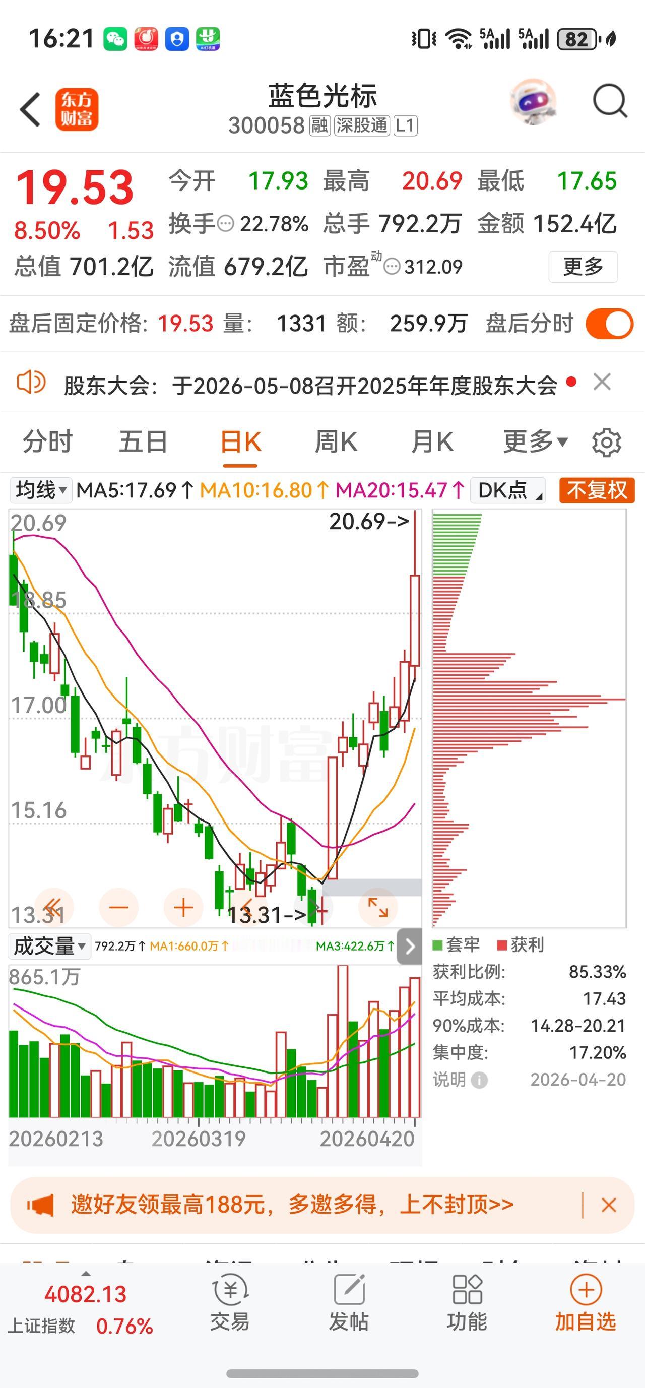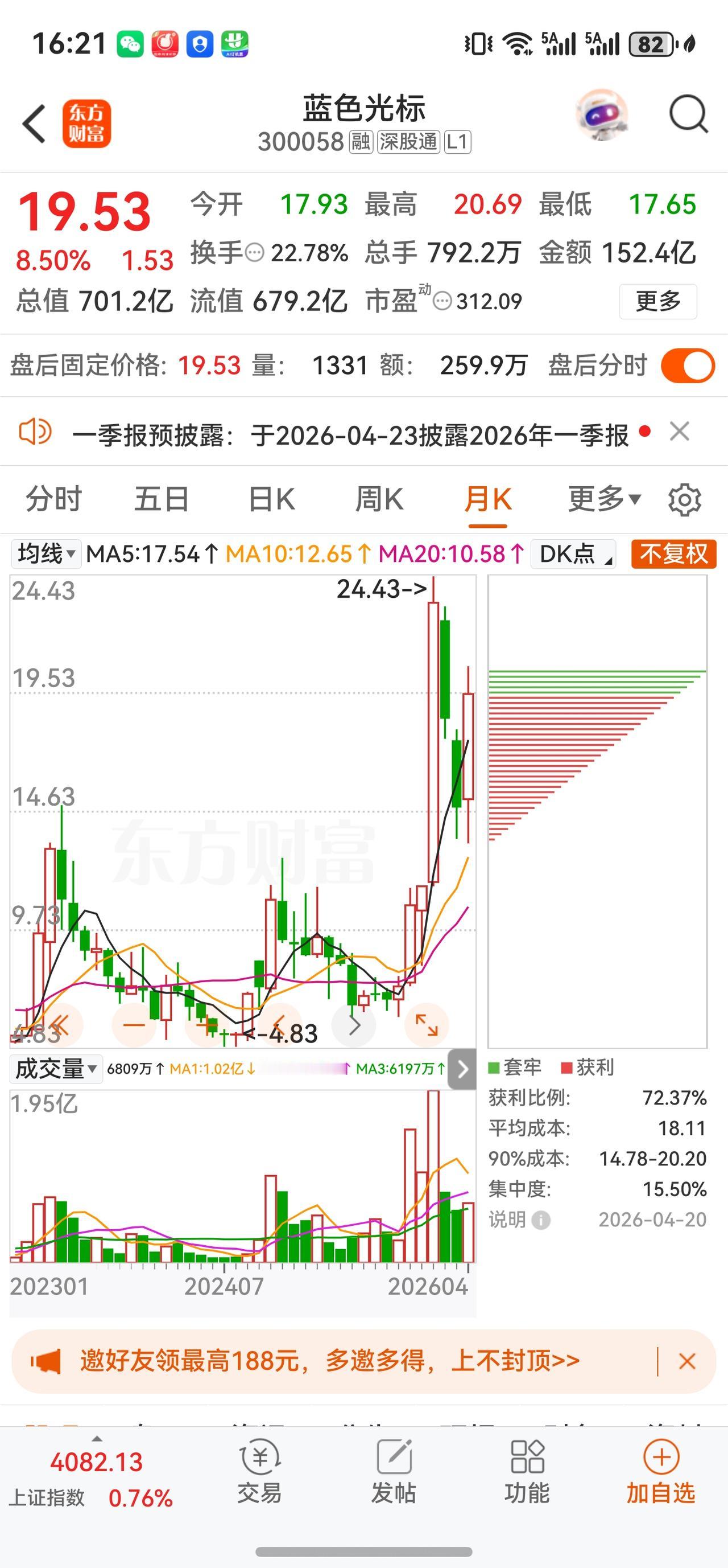 截至今日(4月20日)收盘,蓝色光标A股收报19.53元,全天涨幅8.50%,成交额约152亿元,换手率约21.26%,盘中振幅达16.89%。