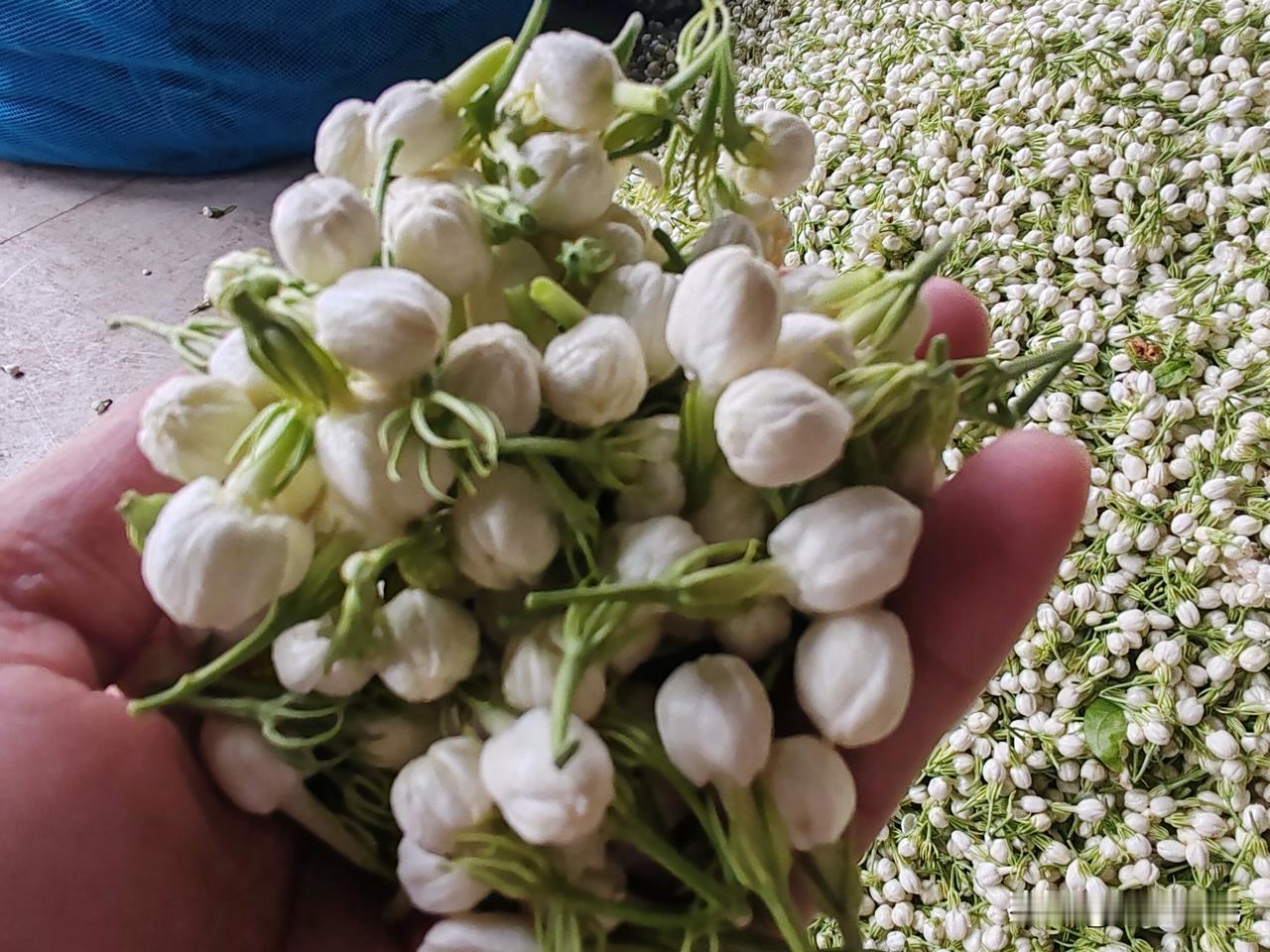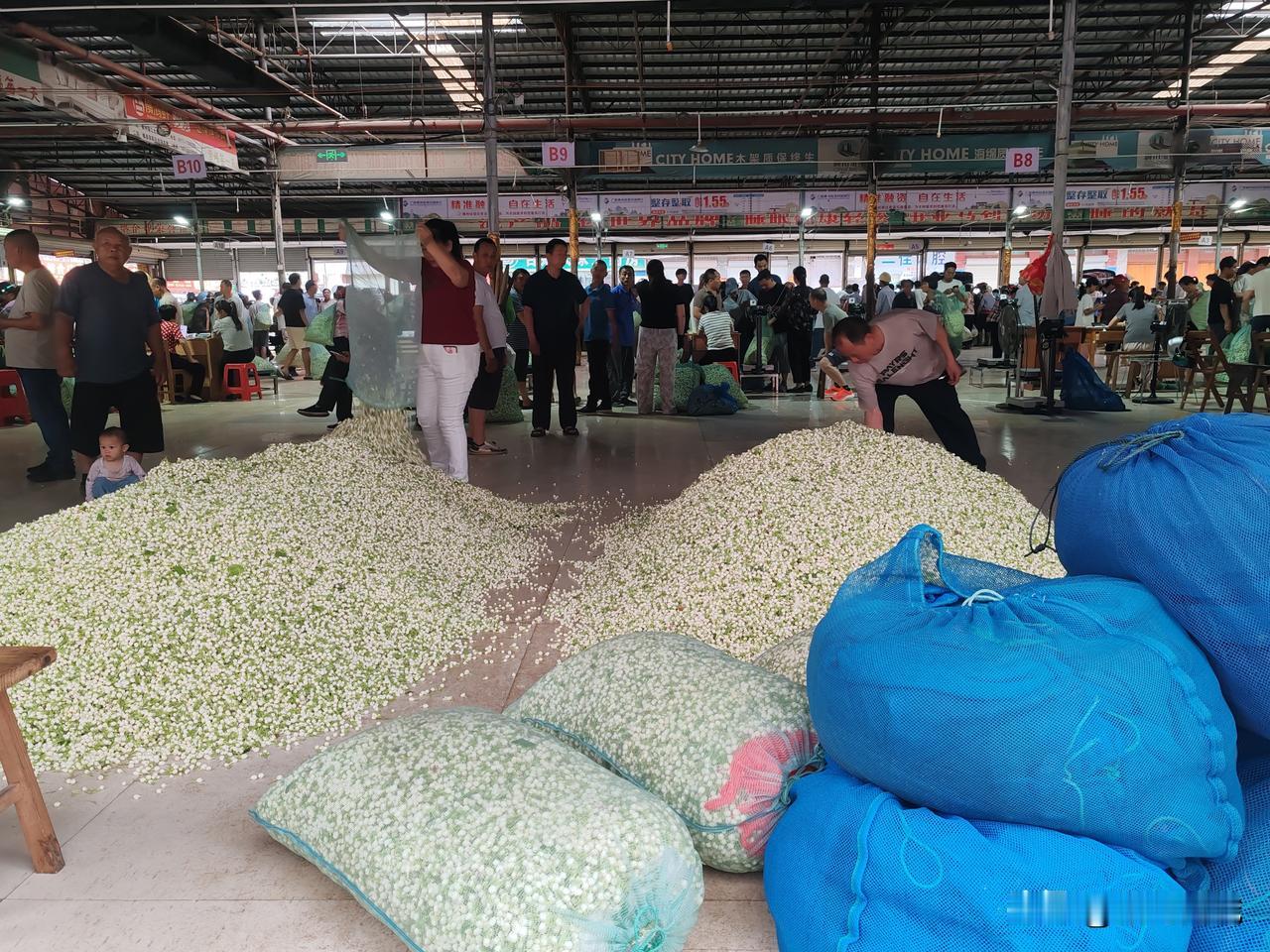 下午4点多我就到了交易市场,那里已经人流涌动了,今天的茉莉花特别的多,看着进进出出的群众,笑容没有那么灿烂,进到里面听到的收购价是7.5元/斤,但是随着不断涌进的卖花人流,价格随之出现了波动,有人开始喊收购价7元/斤了,随着价格的降落,纷纷引来了一波群众果断出手,马上把茉莉花卖了,每次都是这样,一掉价就会争先恐后的排队卖花。