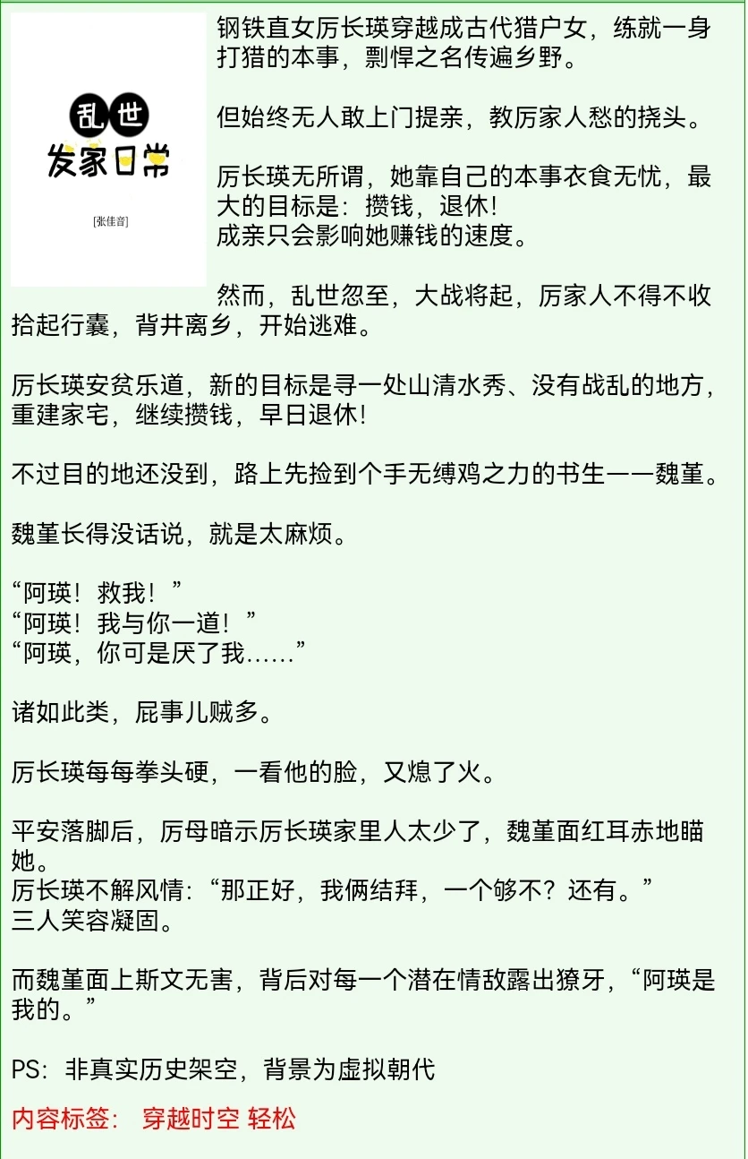 [种草R]完结撒花,来自老牌作者张佳音,依旧是她擅长的女强文,彪悍直球猎户女VS绿茶腹黑世家子,乱世逃难发家,女主外,男主内,轻松爽文。