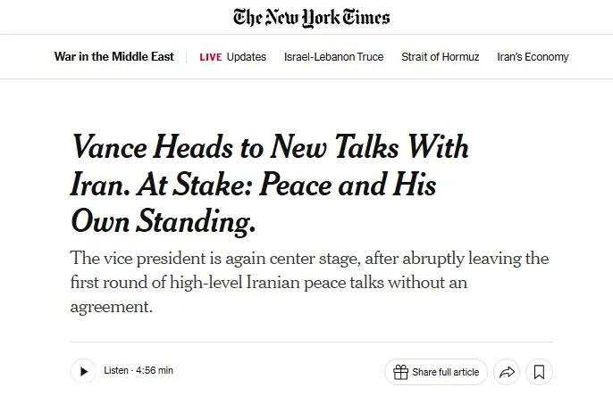 纽约时报说的很直白,万斯本周再赴巴基斯坦,重启美伊谈判。这场谈判,对他而言,早已不只是外交博弈,更是一场输不起的政治自救。翻译一下——万斯才是那个比伊朗更输不起的人。