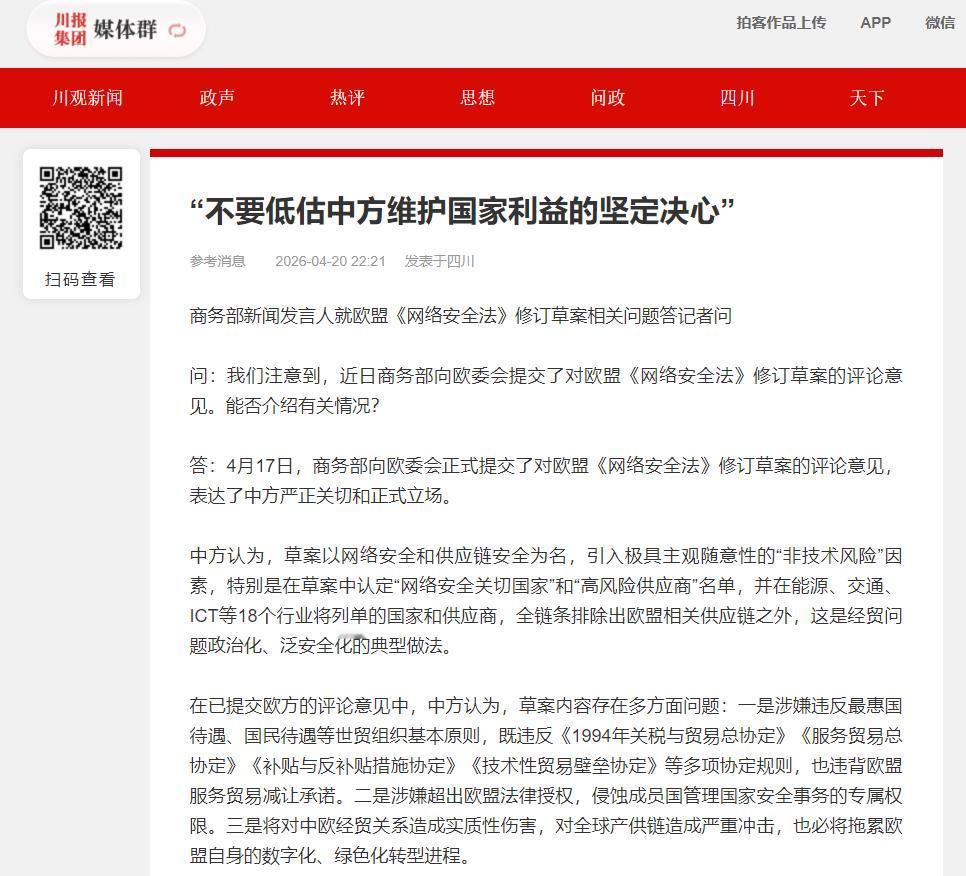 4月17日,咱们国家商务部正式给欧盟递了意见,针对他们正在改的《网络安全法》草案,明明白白说了我们的不满和立场。