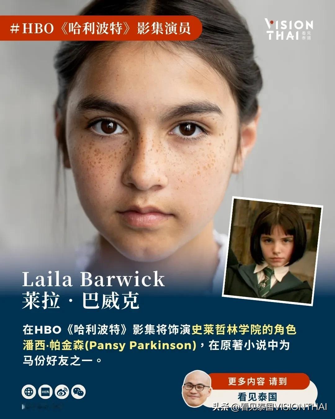 随着HBO《哈利波特》(Harry Potter)影集的筹备进度逐渐曝光,全球粉丝的目光都聚焦在下一代霍格沃茨学生的选角上。其中泰英混血演员莱拉‧巴威克(Laila Barwick)将加入魔法世界,饰演史莱哲林学院的角色潘西·帕金森(Pansy Parkinson),在原著小说中为马份好友之一。