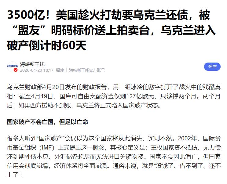 乌克兰真要完了!离破产就剩60天。以前喊着“全力帮它”的美国,不光不伸手,还拿着3500亿的账单上门要债,把这个还在打仗的国家,当成破烂商品明码标价,直接送上了“拍卖台”。