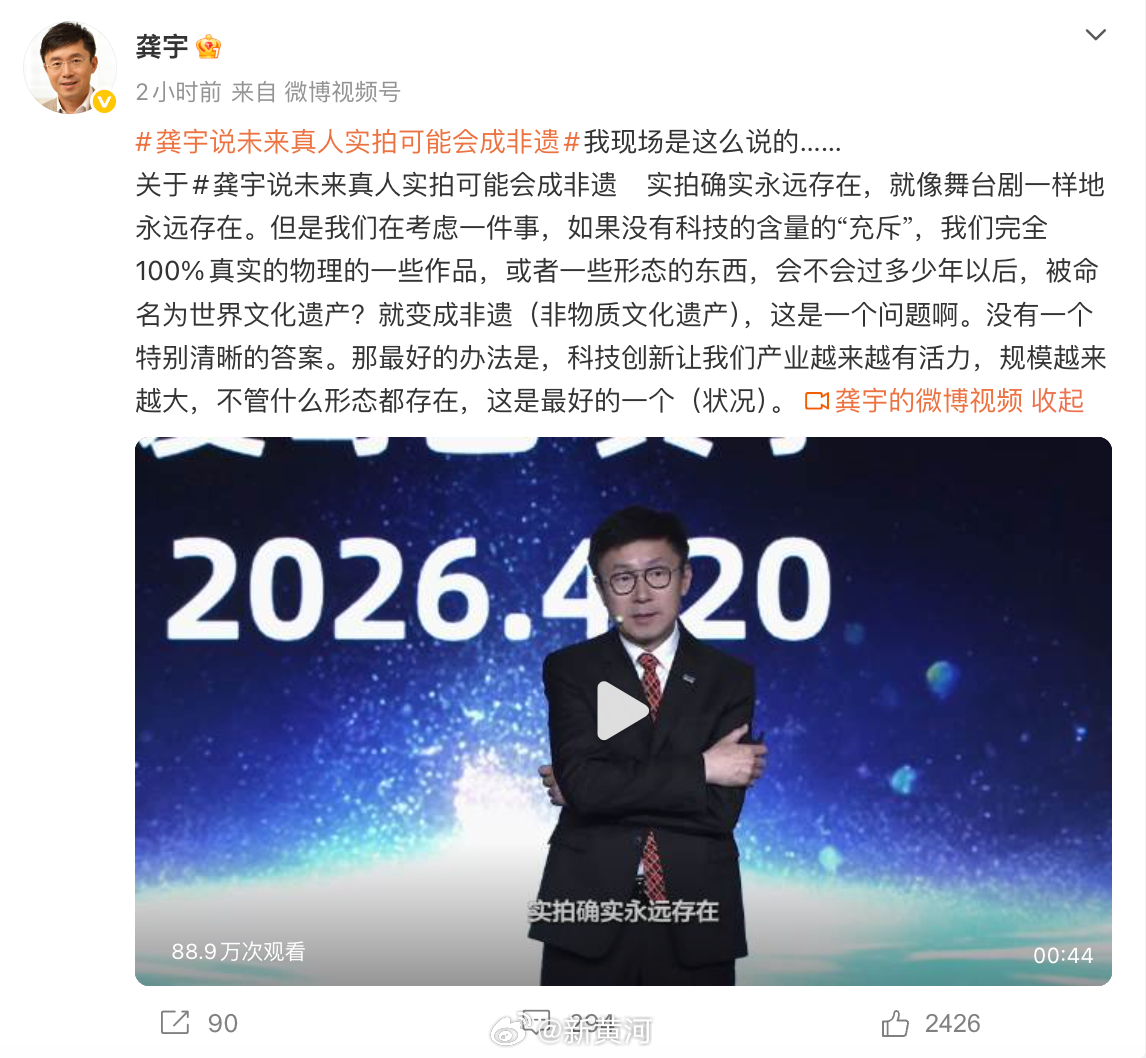 龚宇在微博中解释了“实拍成非遗”的具体语境。他澄清,真人实拍会永远存在,就像舞台剧一样。之前的表述更多是提出一个假设:如果没有技术参与,完全依赖物理实拍,未来会不会变成类似文化遗产的东西。他想表达的理想状态是,技术把行业规模做大,让不同的创作形态可以同时存在。