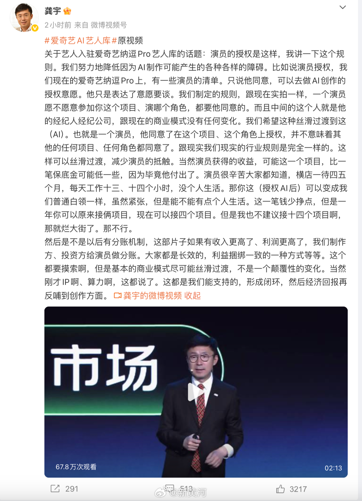 【#龚宇回应AI争议网友为何不买账# ?|大鱼财经】#爱奇艺CEO龚宇发声# 4月21日上午,针对前一日引发巨大争议的“真人实拍将成非遗”言论,爱奇艺CEO在个人微博做出回应。他接连发布多段现场视频,并配文解释称“科技永远不是为了取代人”。然而,面对平台高管的亲自下场,社交平台上的质疑声并没有平息。