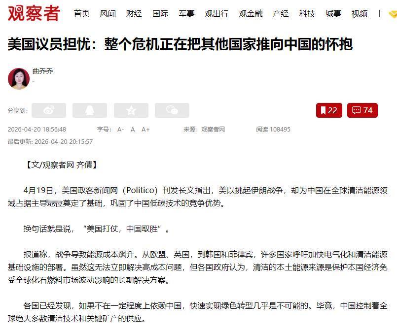 4月19日,美国政客新闻网发了篇长文,说白了就一句话:美国和以色列一起打伊朗,没占到啥便宜,反倒帮中国在全球清洁能源领域站稳了脚,让中国的低碳技术更厉害。