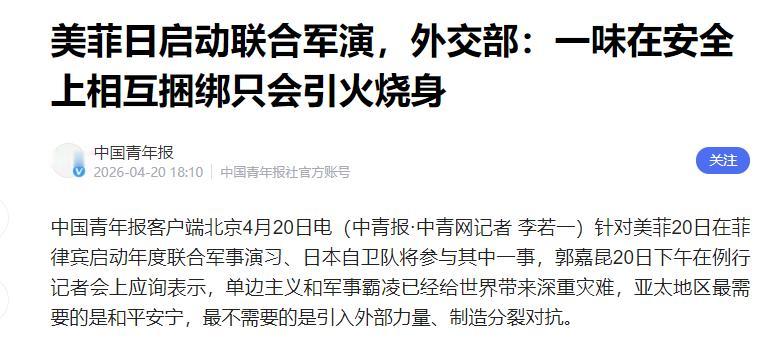 4月20日美菲年度“肩并肩”联合军演正式开启,动静可不小。当天中国外交部就直接表态,态度特别坚决: