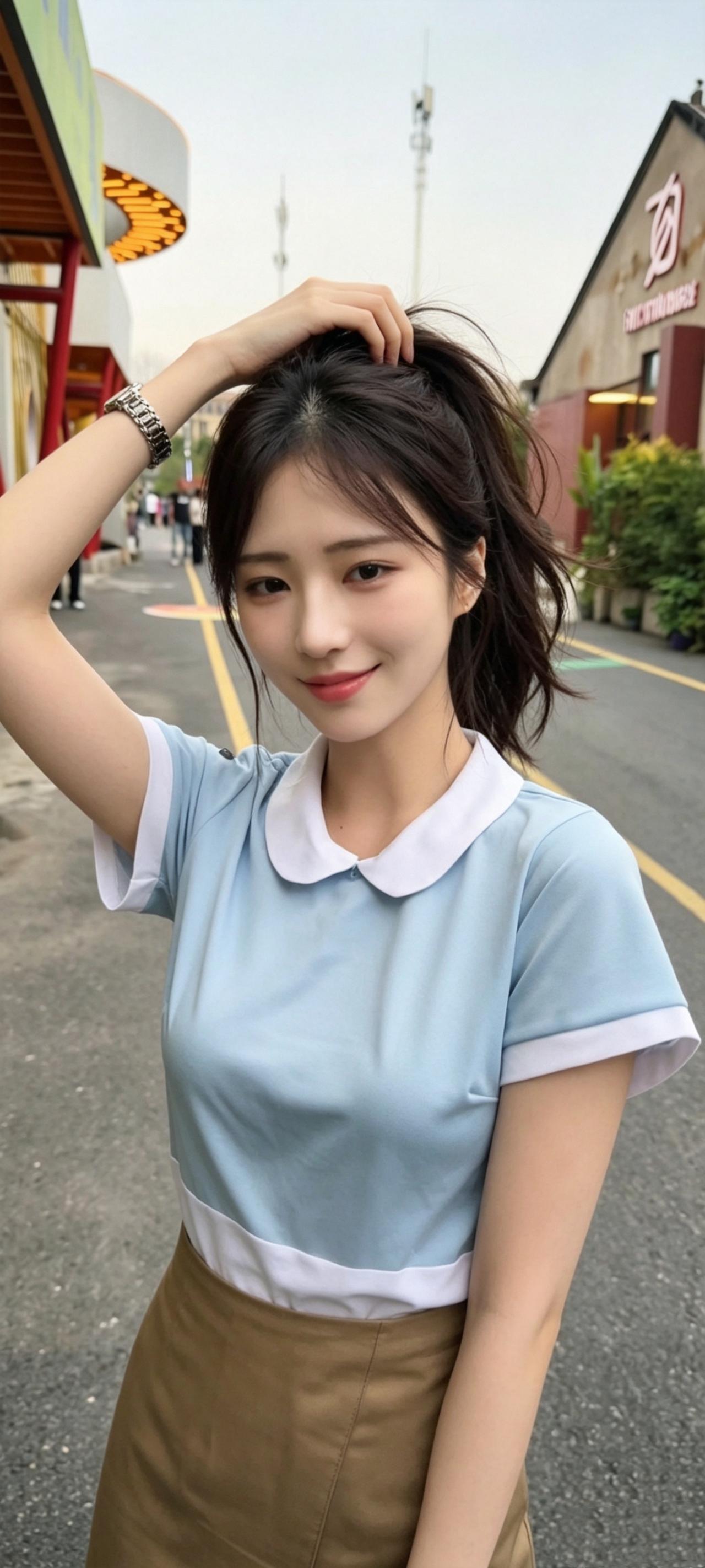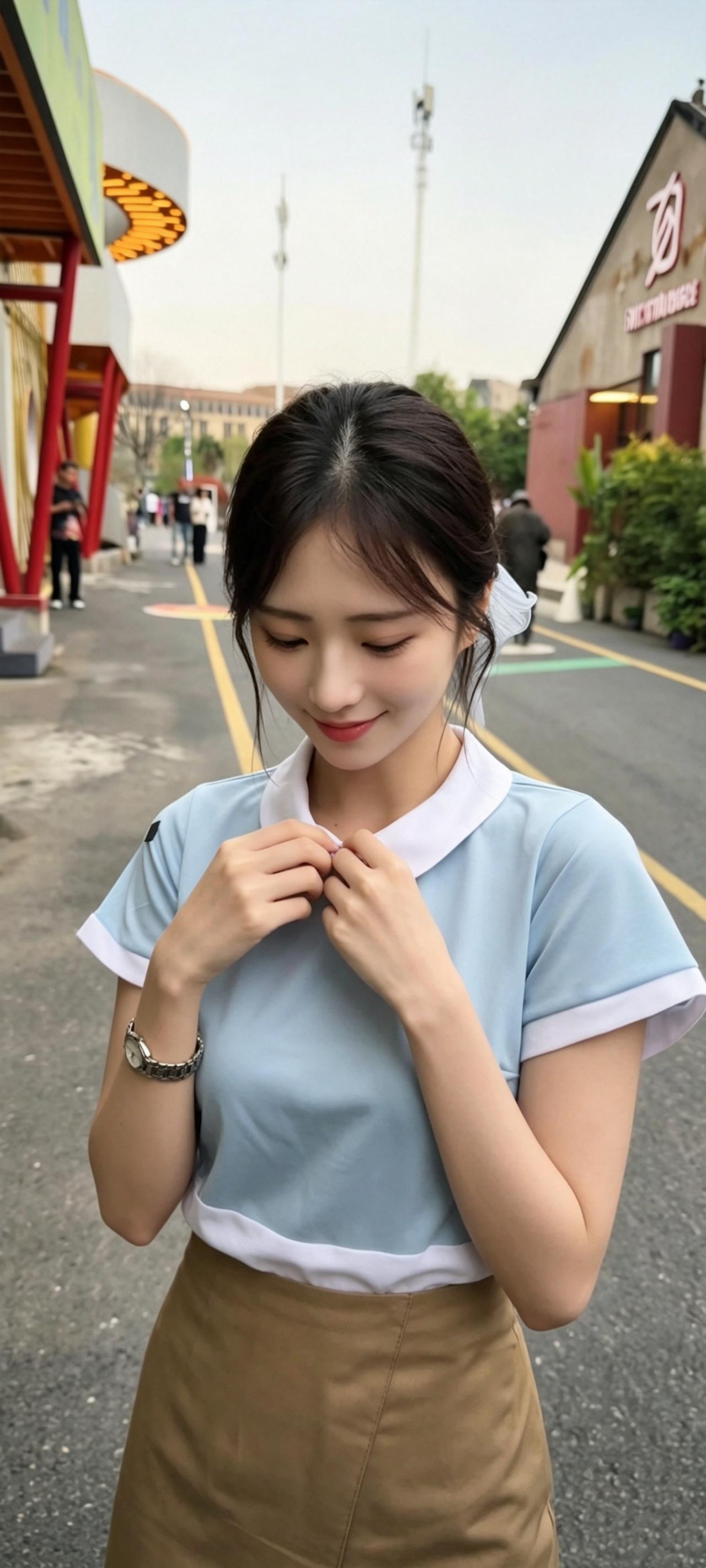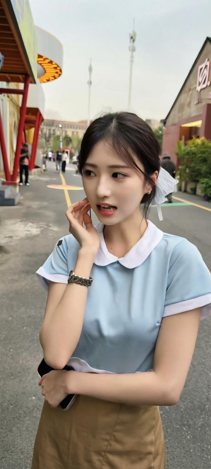 简约街景自带松弛感,蓝白上衣衬得肌肤通透白皙,娃娃领增添少女感。发丝轻垂脸颊,眼神清澈灵动,笑容温柔又甜,尽显少女的纯净与美好,氛围感与精致度并存。