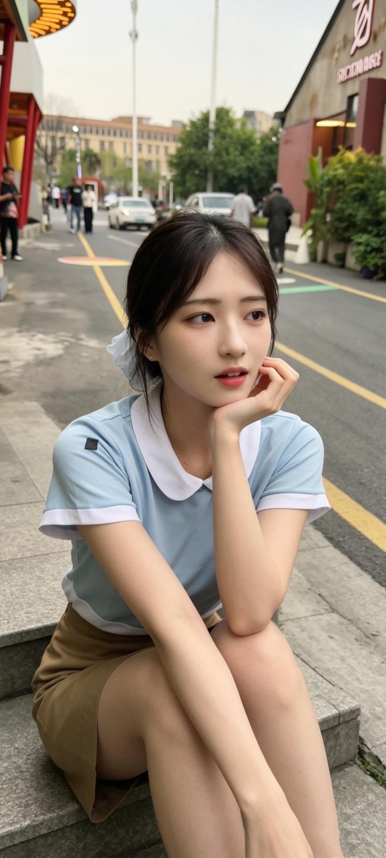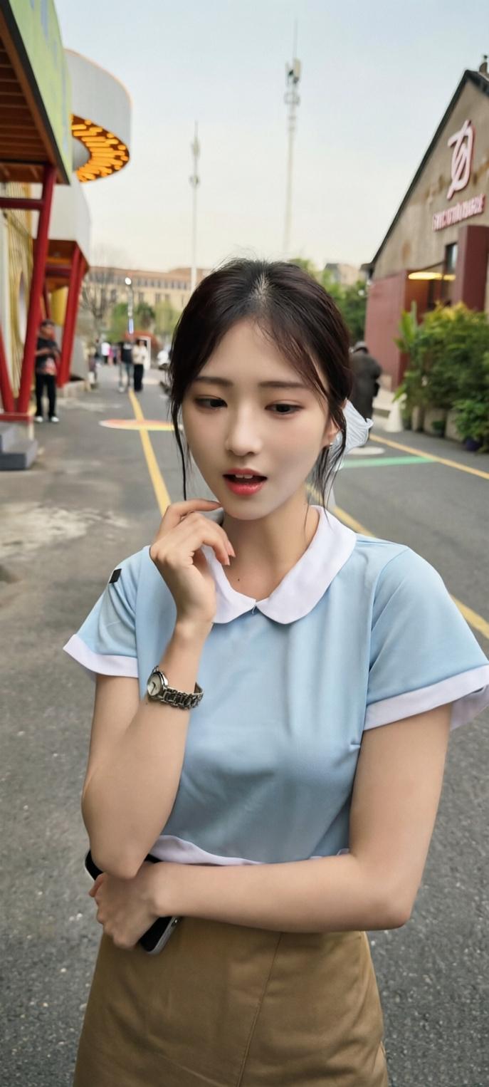 温柔时刻|街角的心动瞬间 简约街景自带松弛感,蓝白上衣衬得肌肤通透白皙,娃娃领增