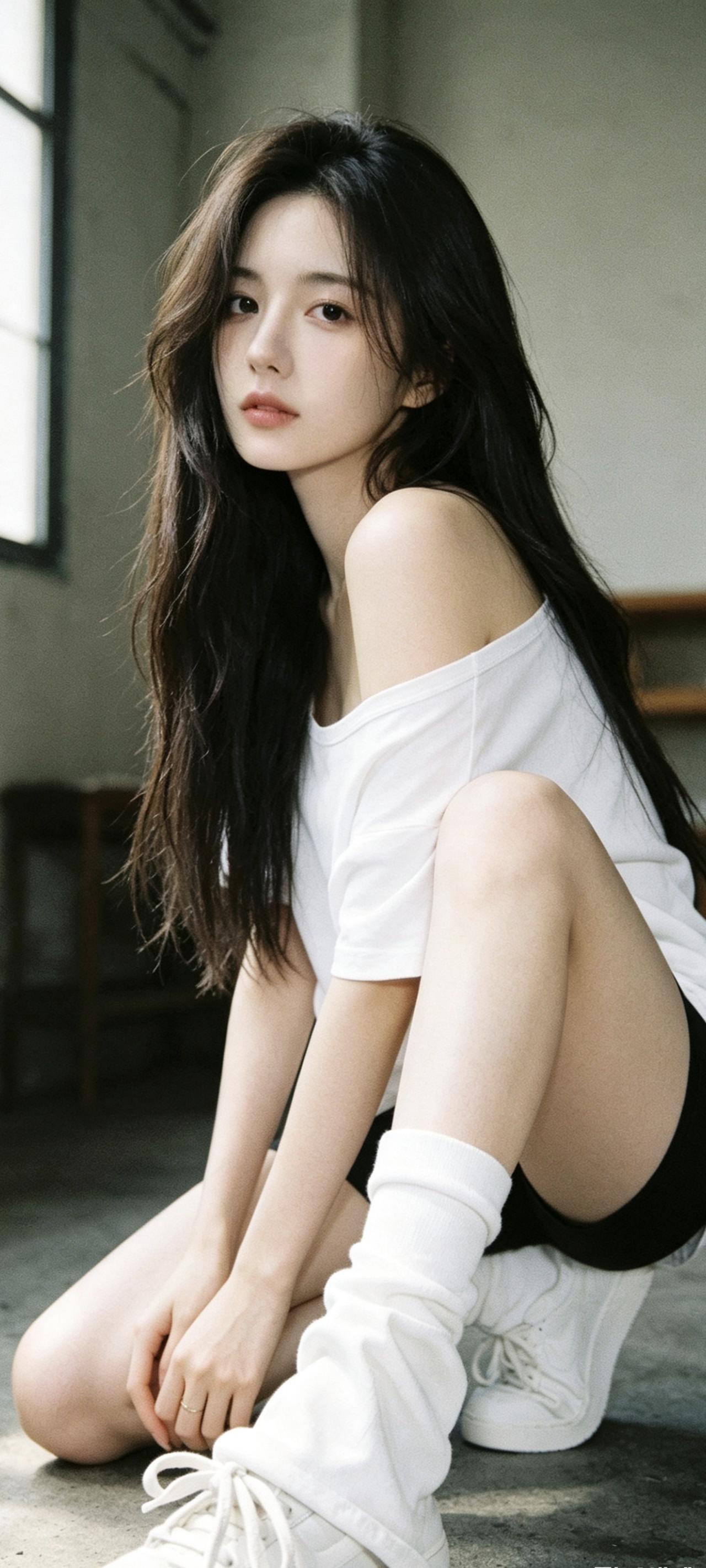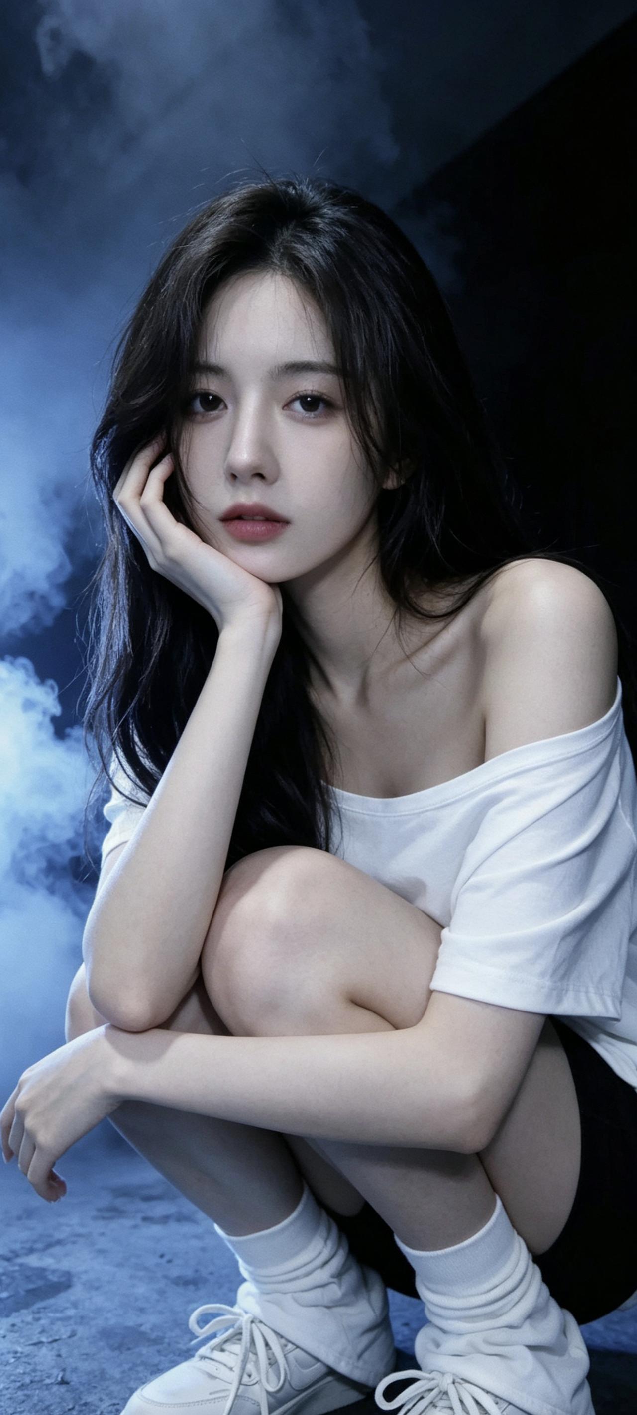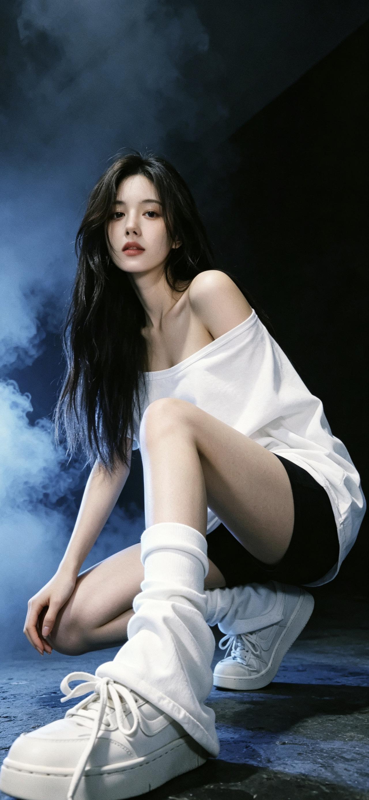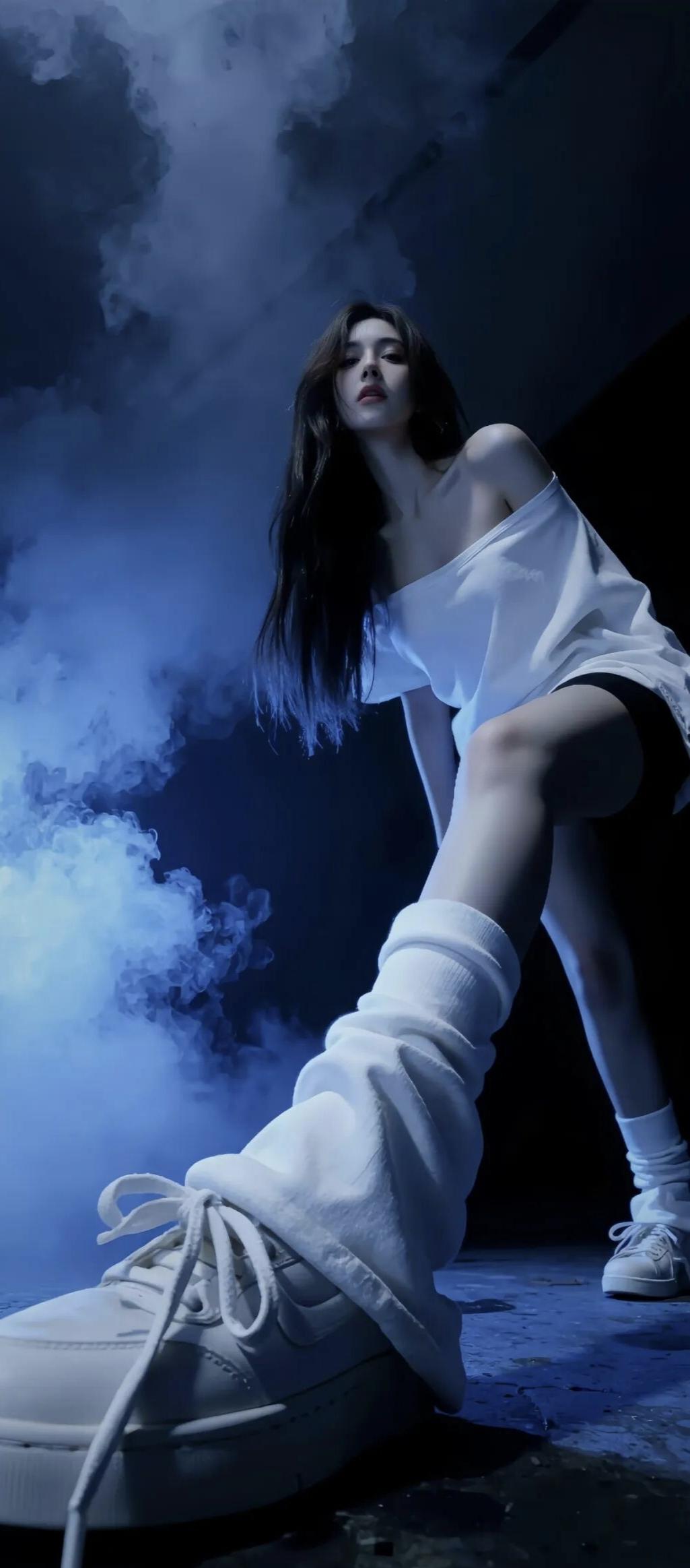甜酷碰撞|烟雾感的纯欲少女 蓝调烟雾作衬,白色斜肩T恤自带松弛感,露肩设计凸显肩颈线条,黑短裤与堆堆袜、小白鞋打造甜酷穿搭。卷发随性垂落,抬手撩发的姿态,将纯欲与酷飒拿捏得恰到好处,氛围感拉满。 美女分享 甜酷穿搭 纯欲天花板