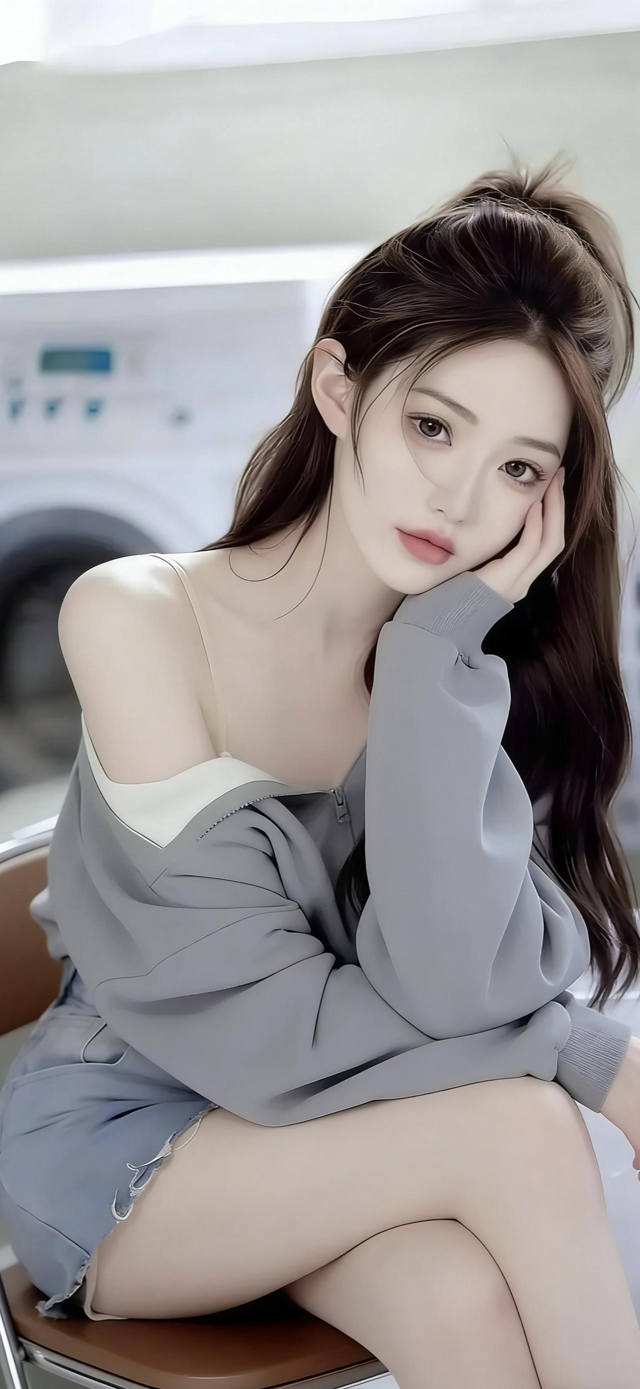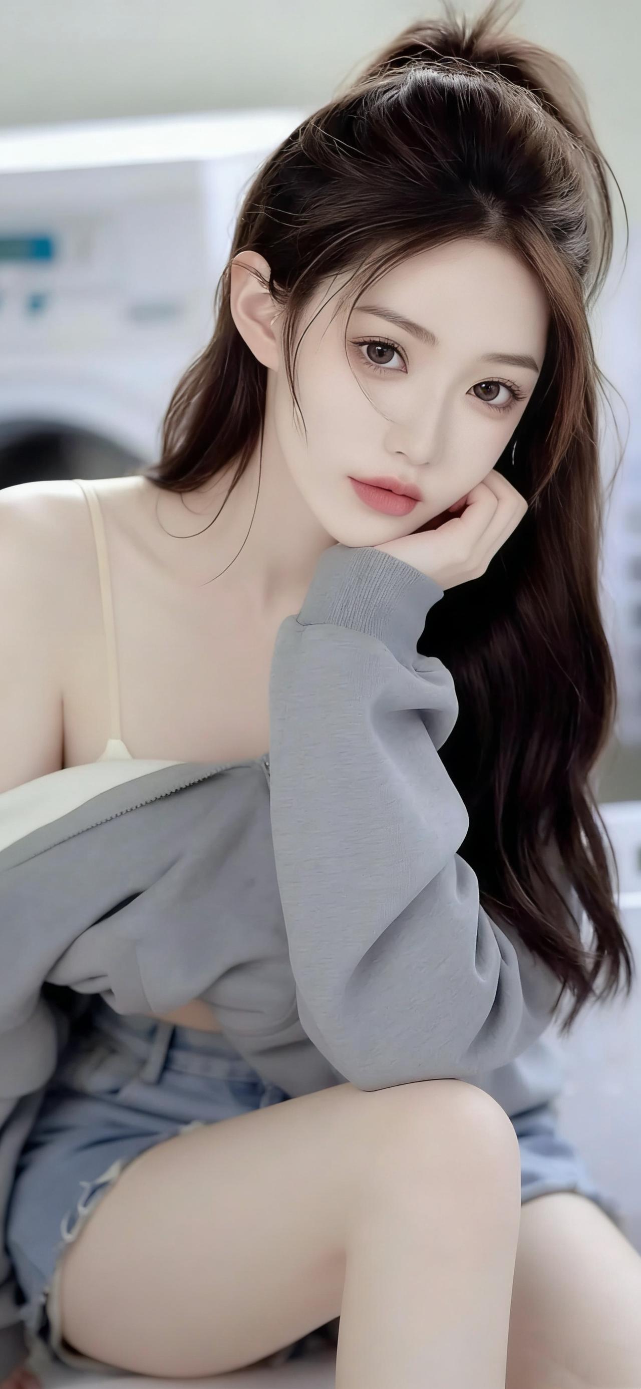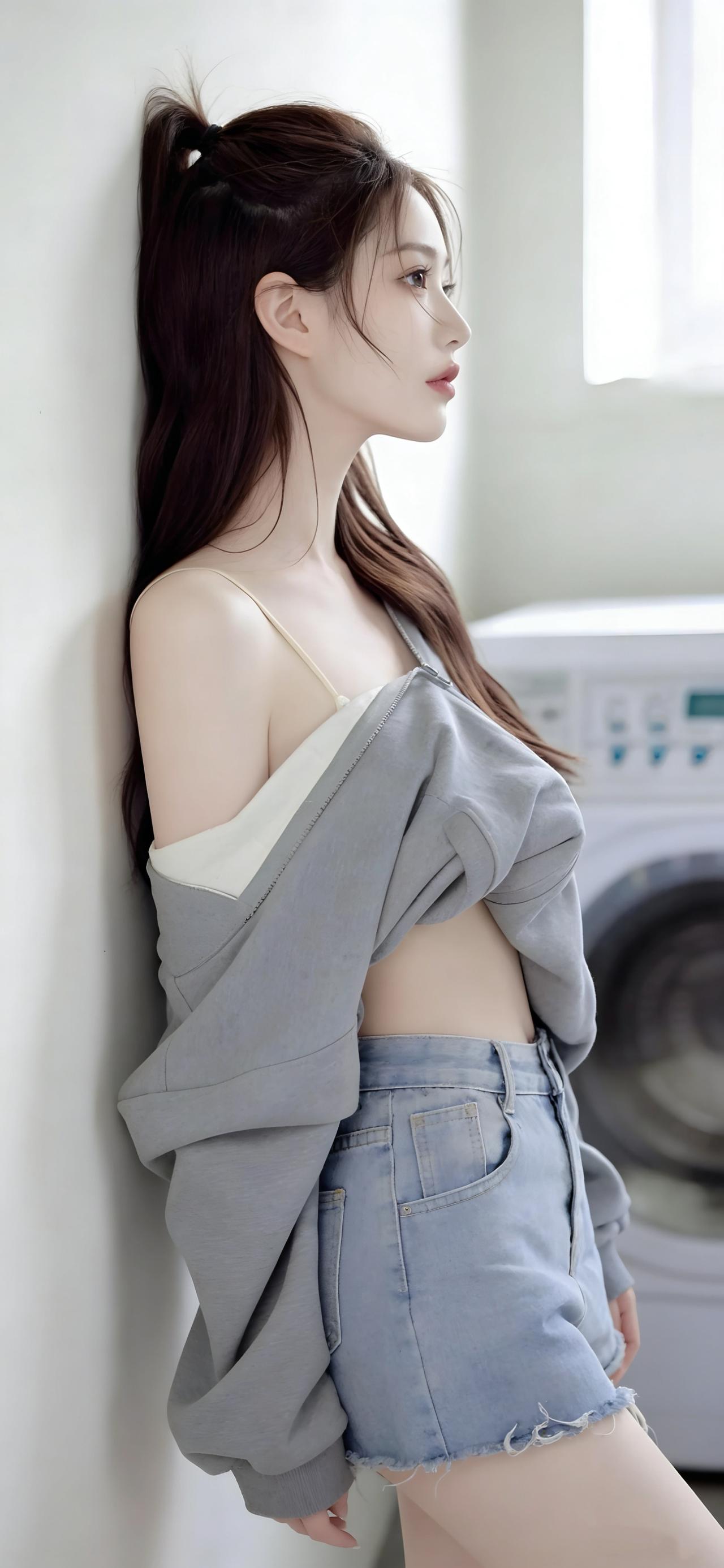 高马尾造型清爽利落,几缕碎发自然散落,修饰出精致的侧颜轮廓,眉眼清澈,唇色淡雅,侧身靠墙的姿态慵懒又自在。背景中简约的居家环境与柔和光线,让焦点完全集中在穿搭与人物本身,画面干净又有质感。