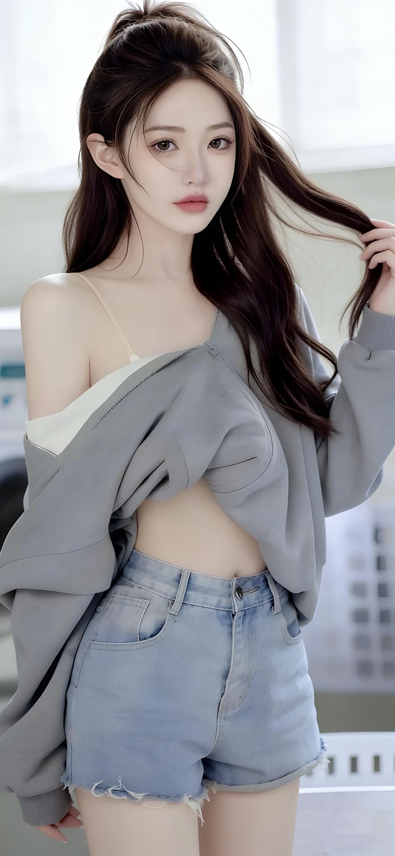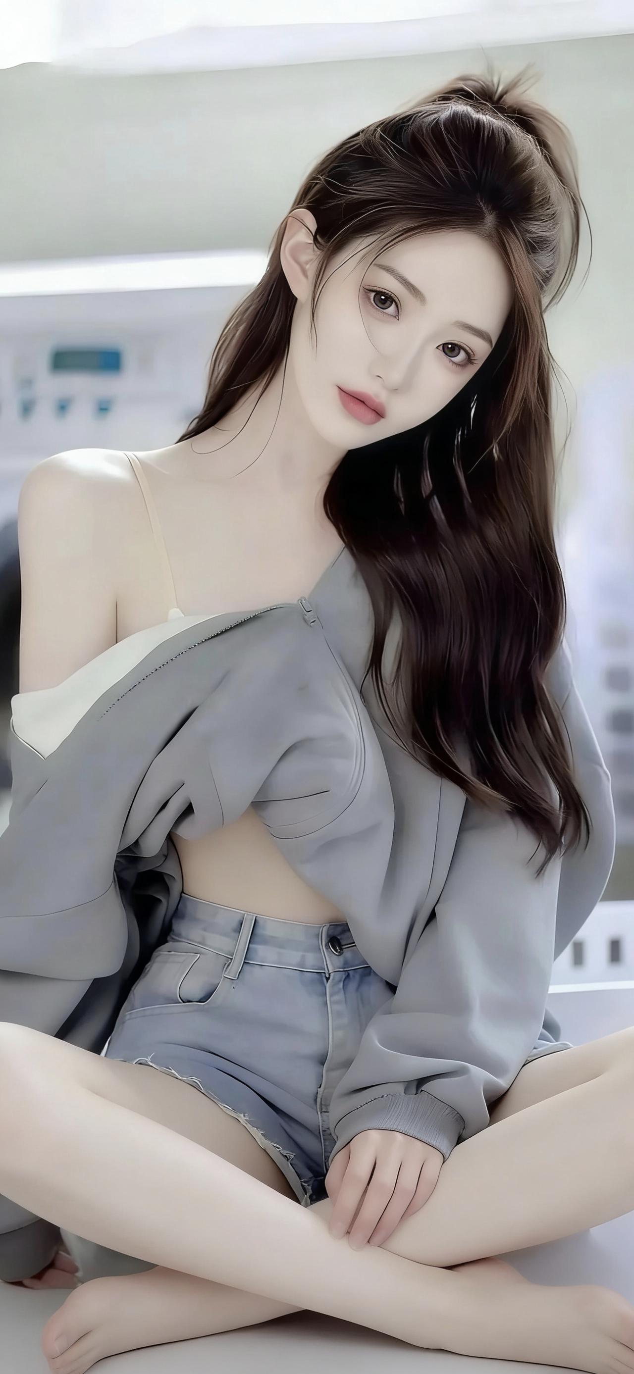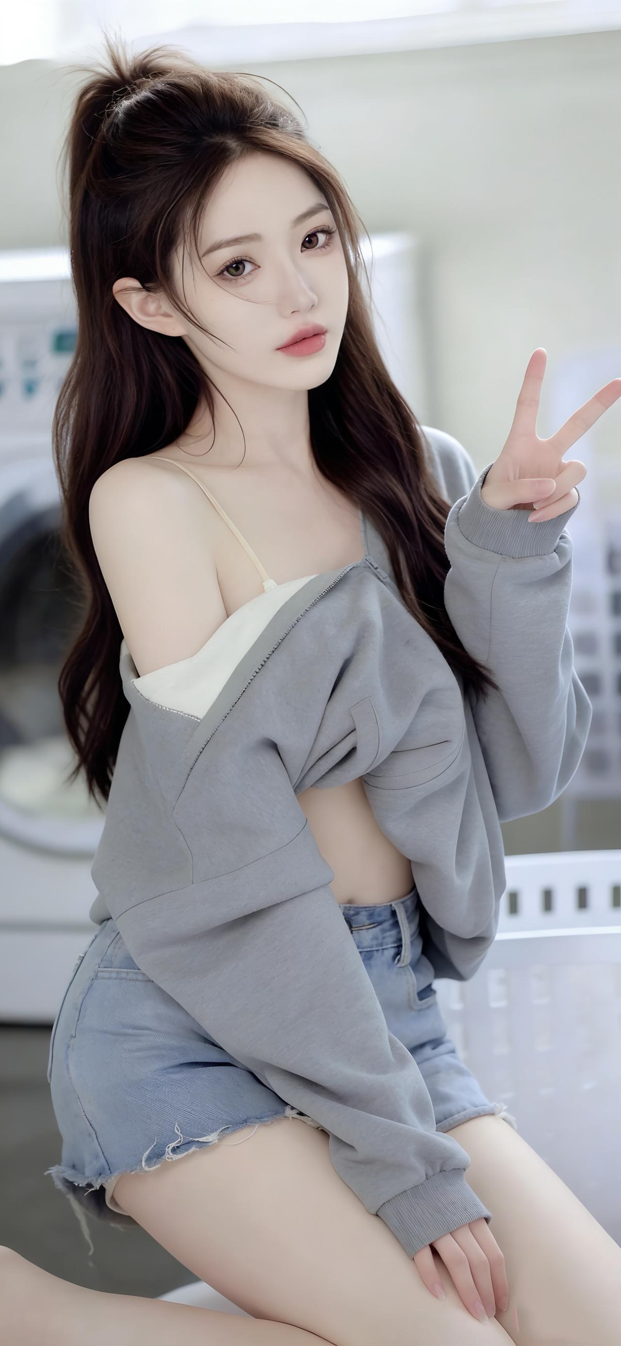 高马尾造型清爽利落,几缕碎发自然散落,修饰出精致的侧颜轮廓,眉眼清澈,唇色淡雅,侧身靠墙的姿态慵懒又自在。背景中简约的居家环境与柔和光线,让焦点完全集中在穿搭与人物本身,画面干净又有质感。
