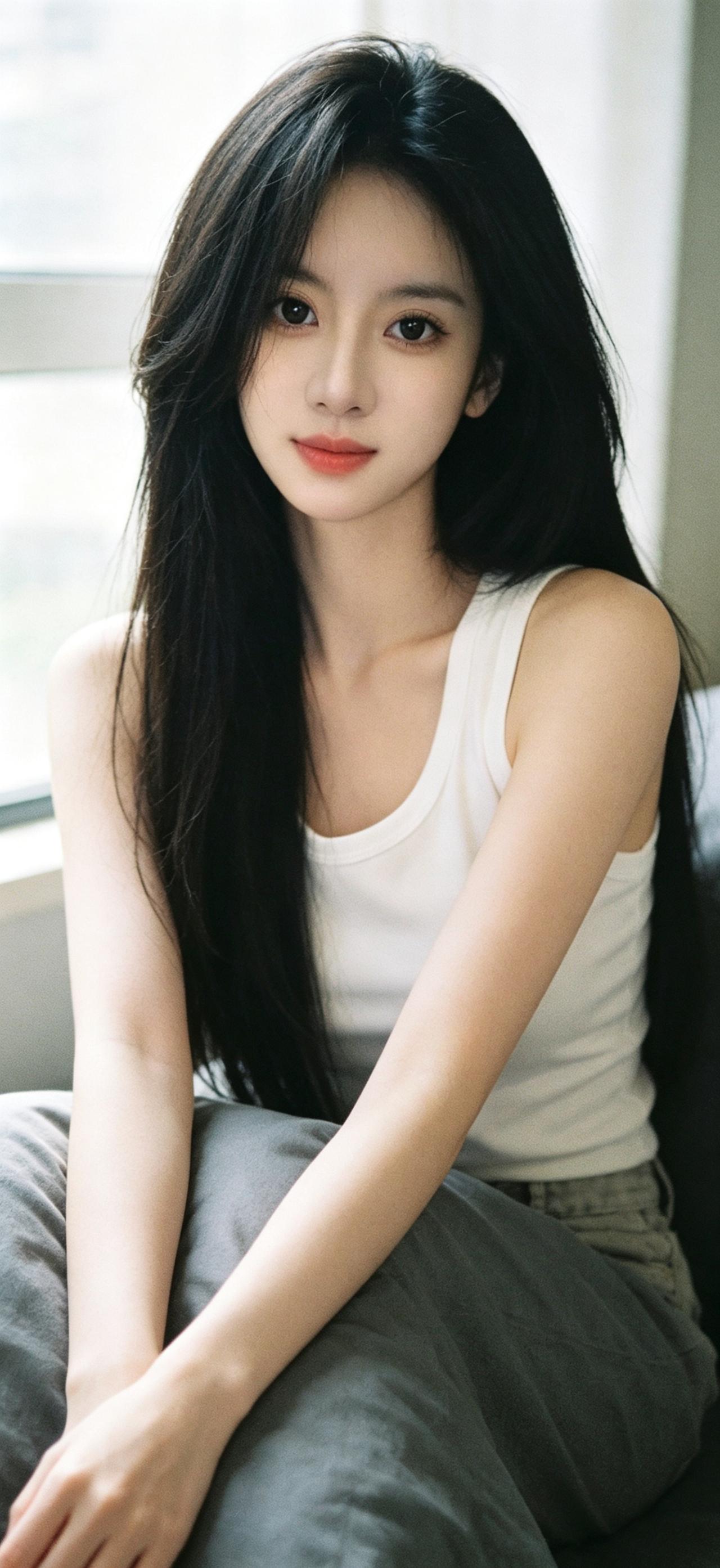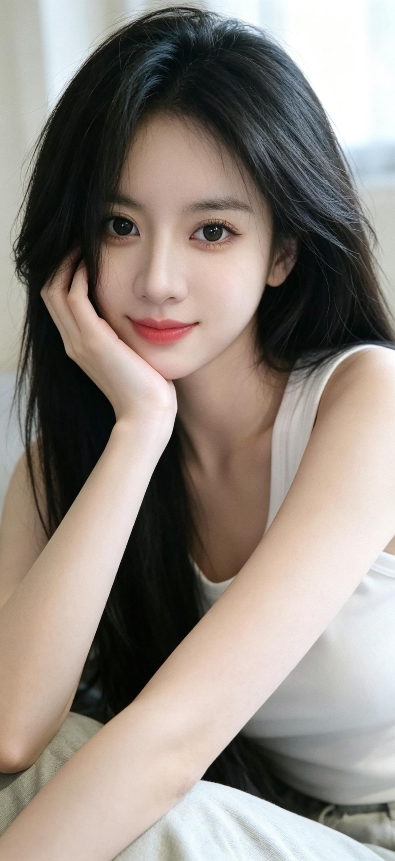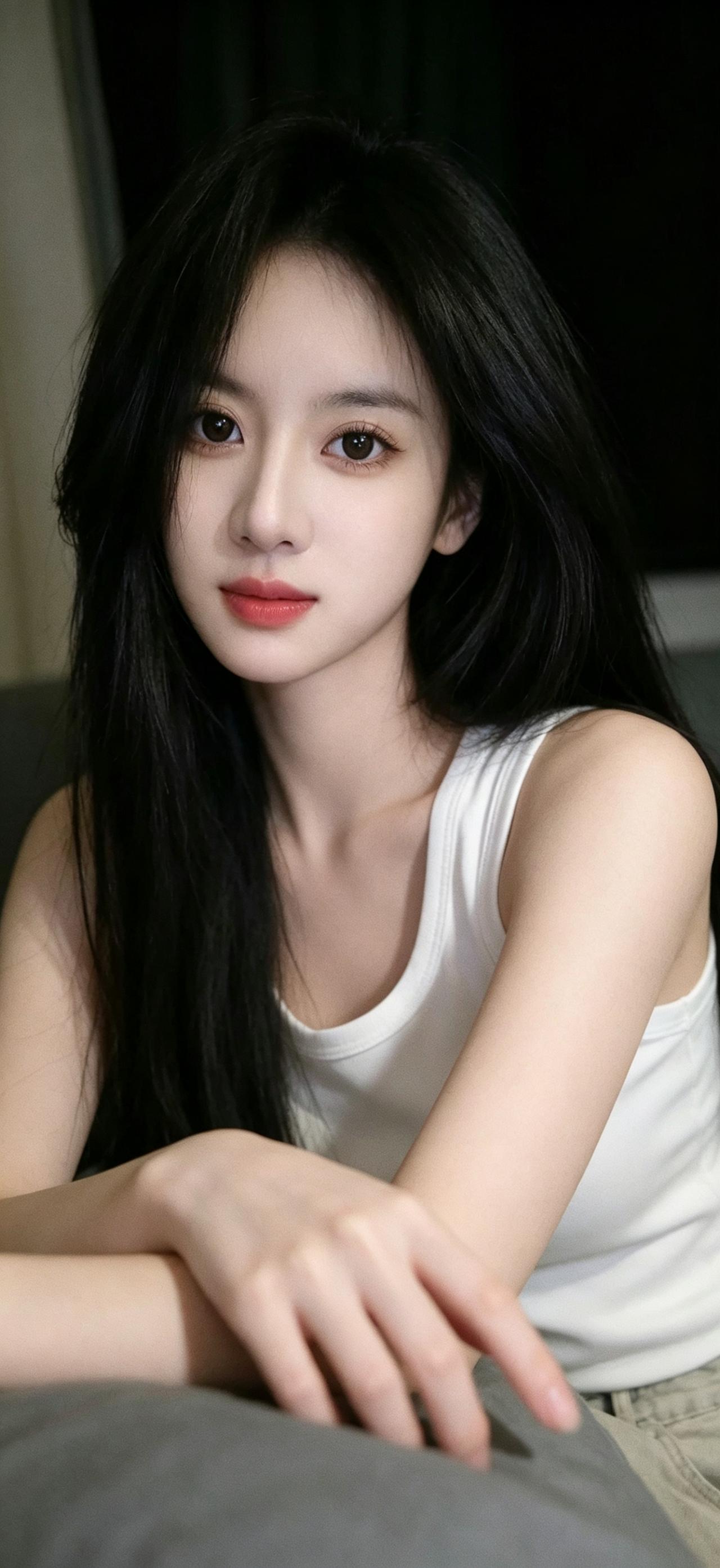 暖调居家作衬,简约白色背心自带纯欲滤镜,修身版型勾勒柔和线条。黑色长直发柔顺垂落,轻托嘴角的姿态清甜自然,将纯欲与温柔拿捏得恰到好处,氛围感拉满。