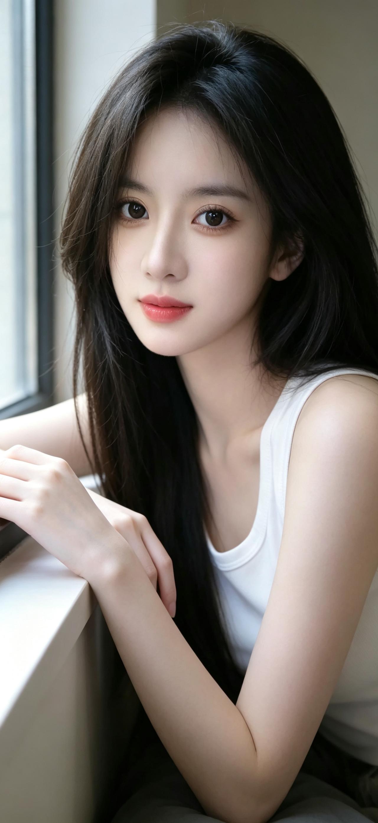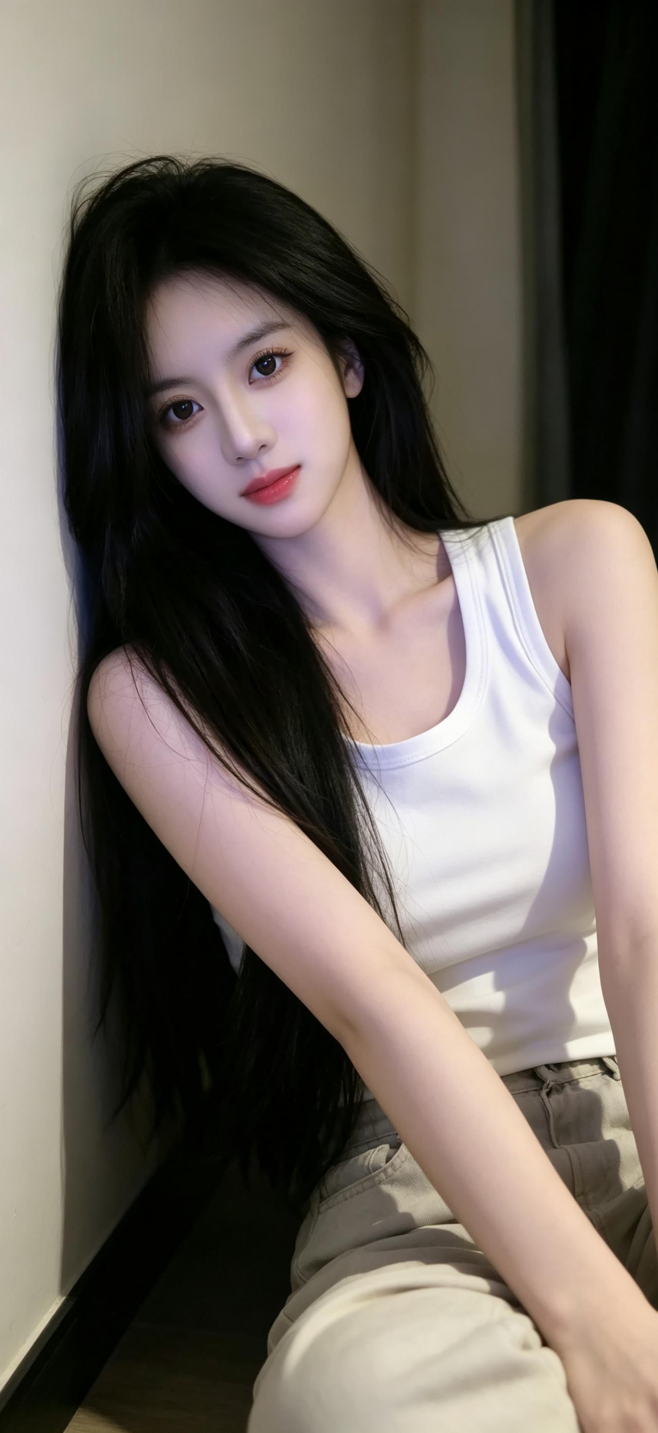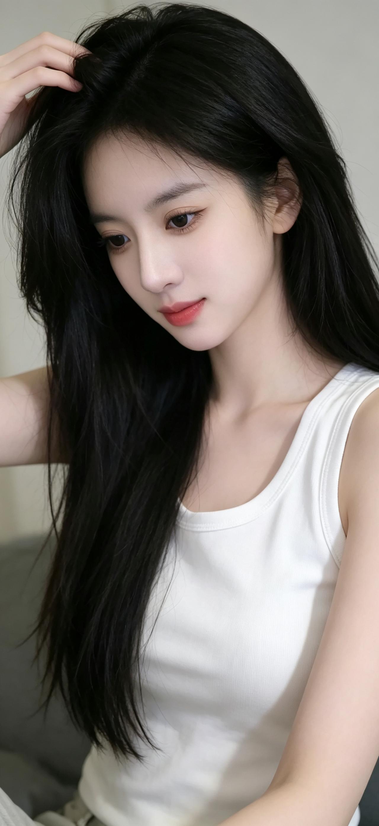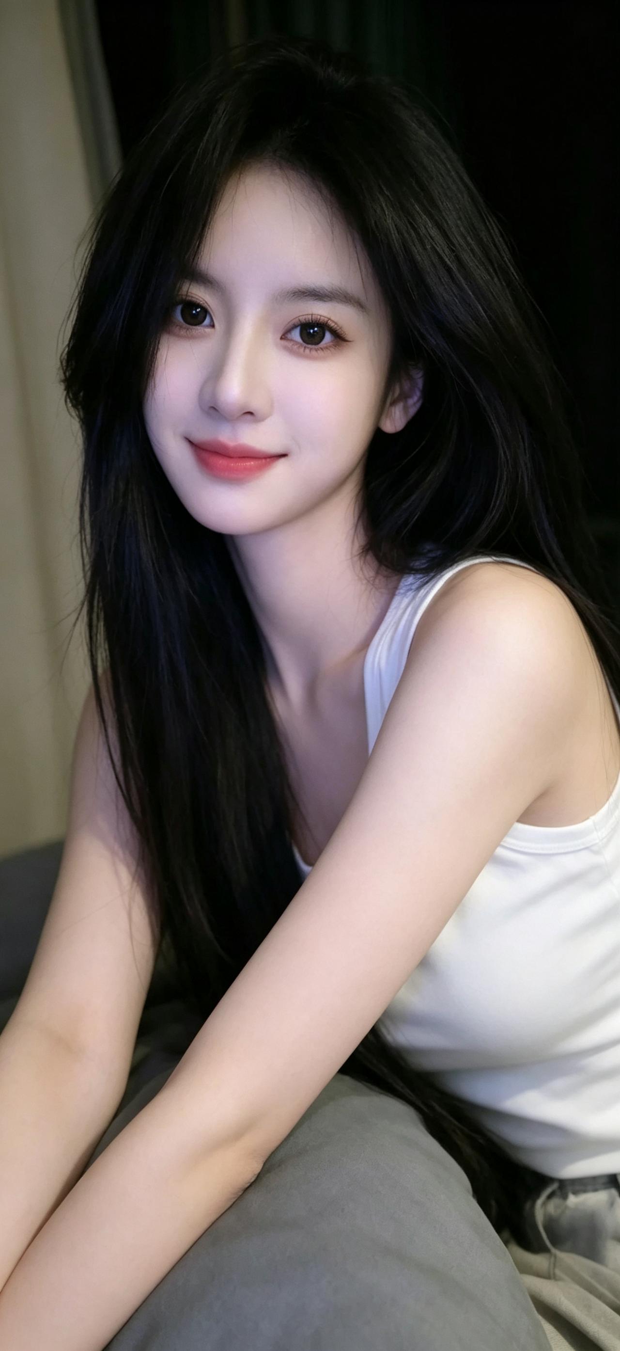 暖调居家作衬,简约白色背心自带纯欲滤镜,修身版型勾勒柔和线条。黑色长直发柔顺垂落,轻托嘴角的姿态清甜自然,将纯欲与温柔拿捏得恰到好处,氛围感拉满。