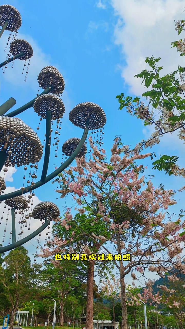 这个音乐公园其实很普通,就是因为它集中性的引入了很多泰国的樱花,就变成网红打卡基地。泰国的樱花又名花旗木,原产泰国缅甸,最近几年被广东很多公园引入,作为了观赏的花木。因为它在3月到5月正式盛开,错开了其他花期,就让广东这些地方一年四季都有花开。并且它的花期可以达到45天,所以欣赏期很久,在这边很受欢迎。