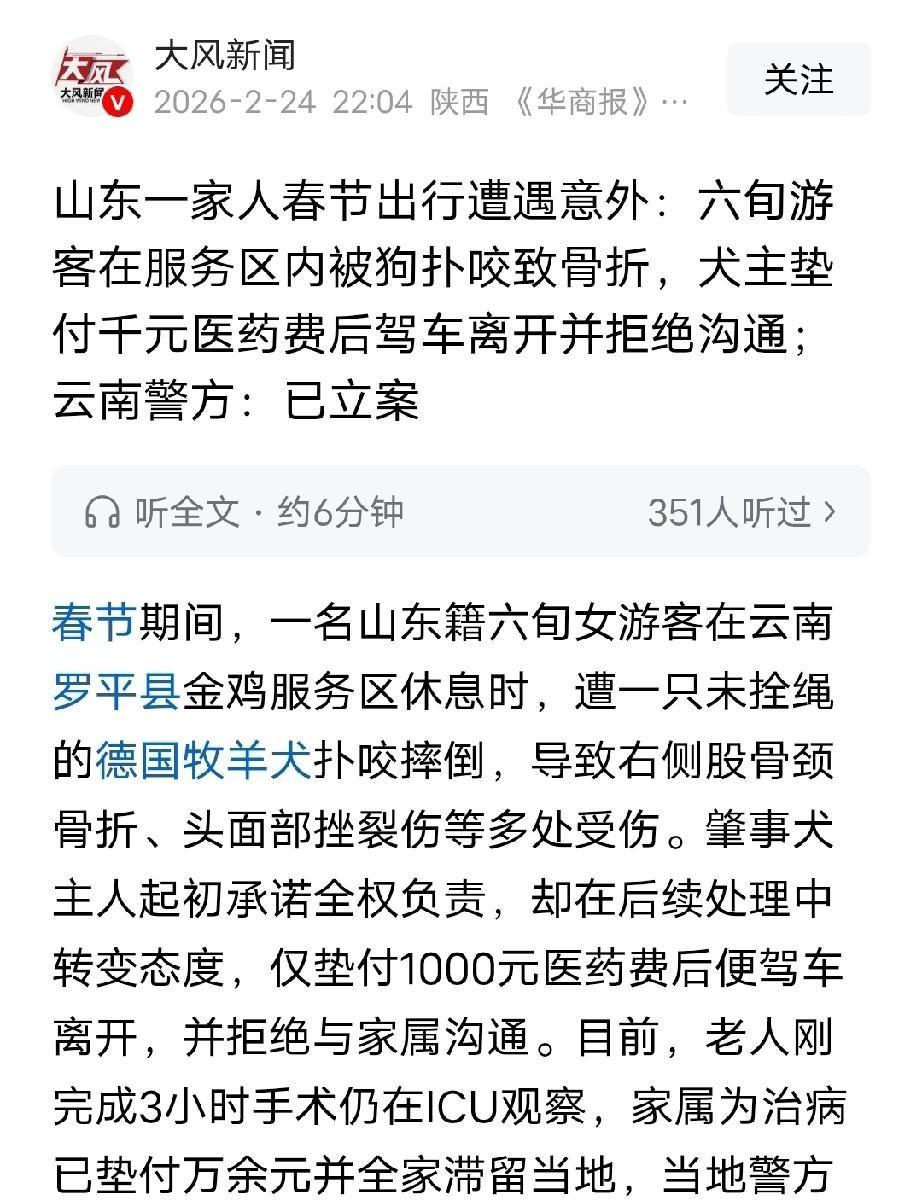 真是开了眼了!山东一家老小跨越两千公里去云南自驾游,本想着开开心心过个年。结果老母亲在服务区下了个车,竟然被一条没拴绳的巨型德牧连续两次生扑撕咬,右腿骨头直接断裂!