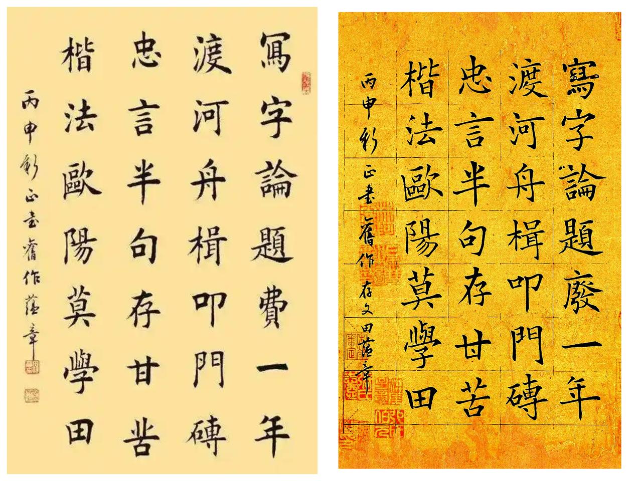 展纸看这两幅字,原作端谨整肃,临作形神追摹,最动人的始终是末句那七个字——‌楷法欧阳莫学田‌。这是田蕴章先生留給书坛的箴言,更是一位真文人刻进骨子里的风骨。
