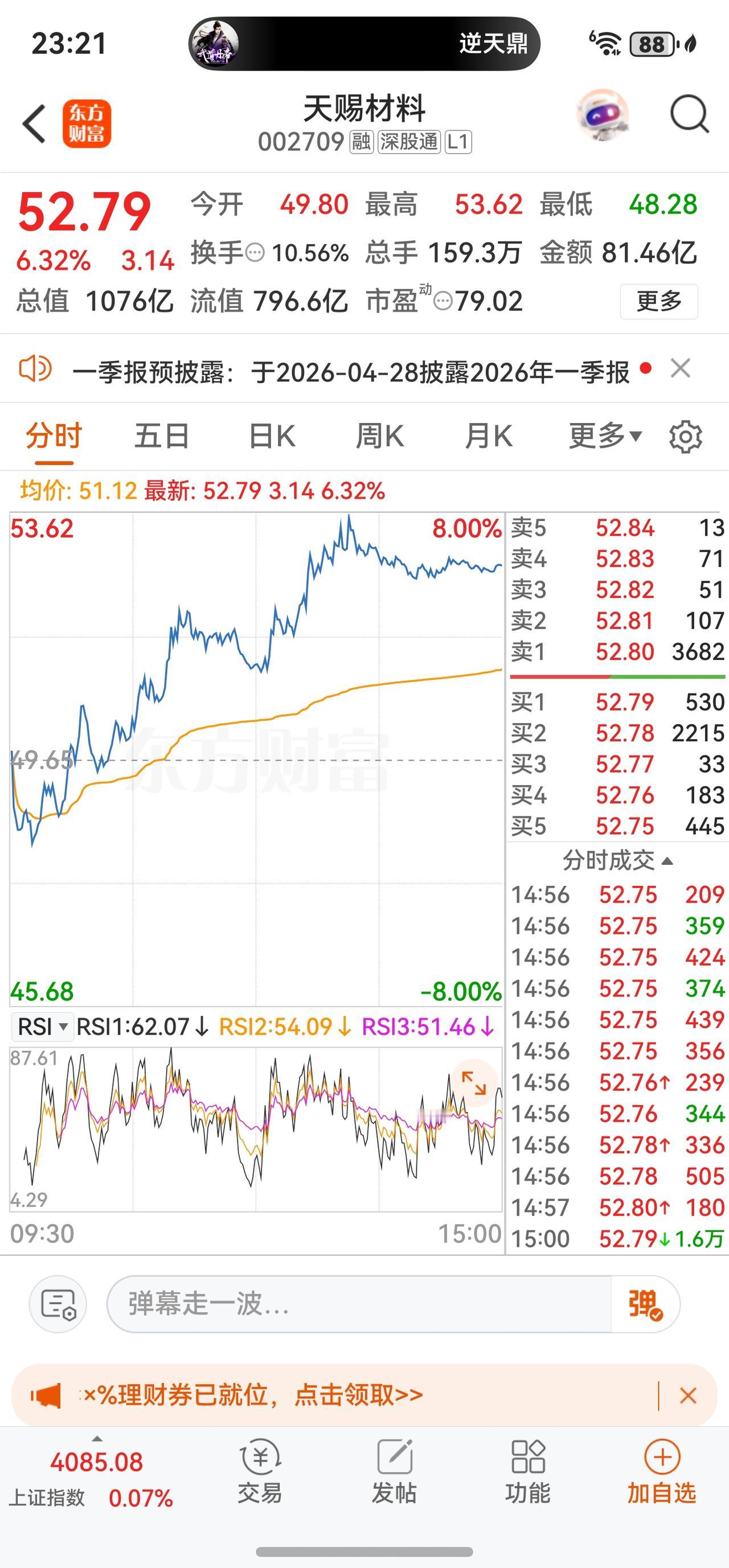 天赐材料A股今日走出低开高走、大幅收涨行情。开盘报49.80元(昨收49.65元),早盘短暂下探至48.28元后快速反弹,5分钟内涨幅超过2%。午后多头再度发力,盘中涨幅一度达5.04%,收盘前维持强势,最终报52.79元,涨幅6.32%。盘中最高触及53.62元,日内振幅达10.76%。