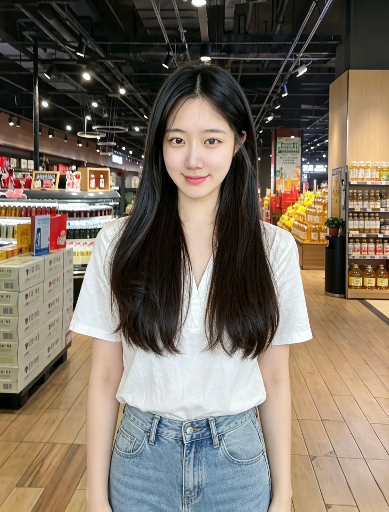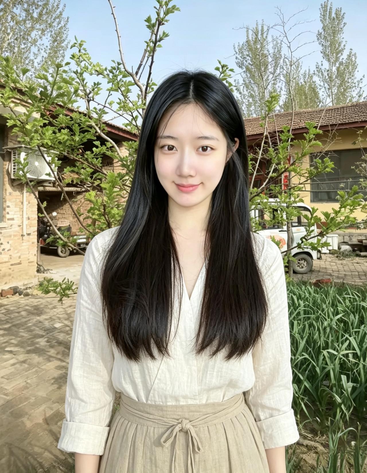 长发如云衬素裙,朝露丝丝润芳芬。 清灵一笑尘嚣尽,恰似春风拂玉人。