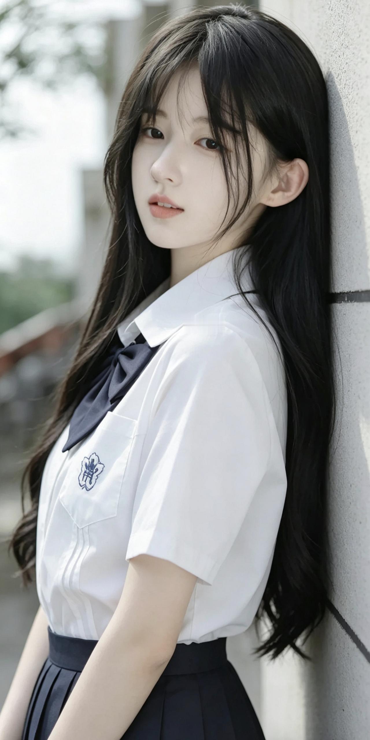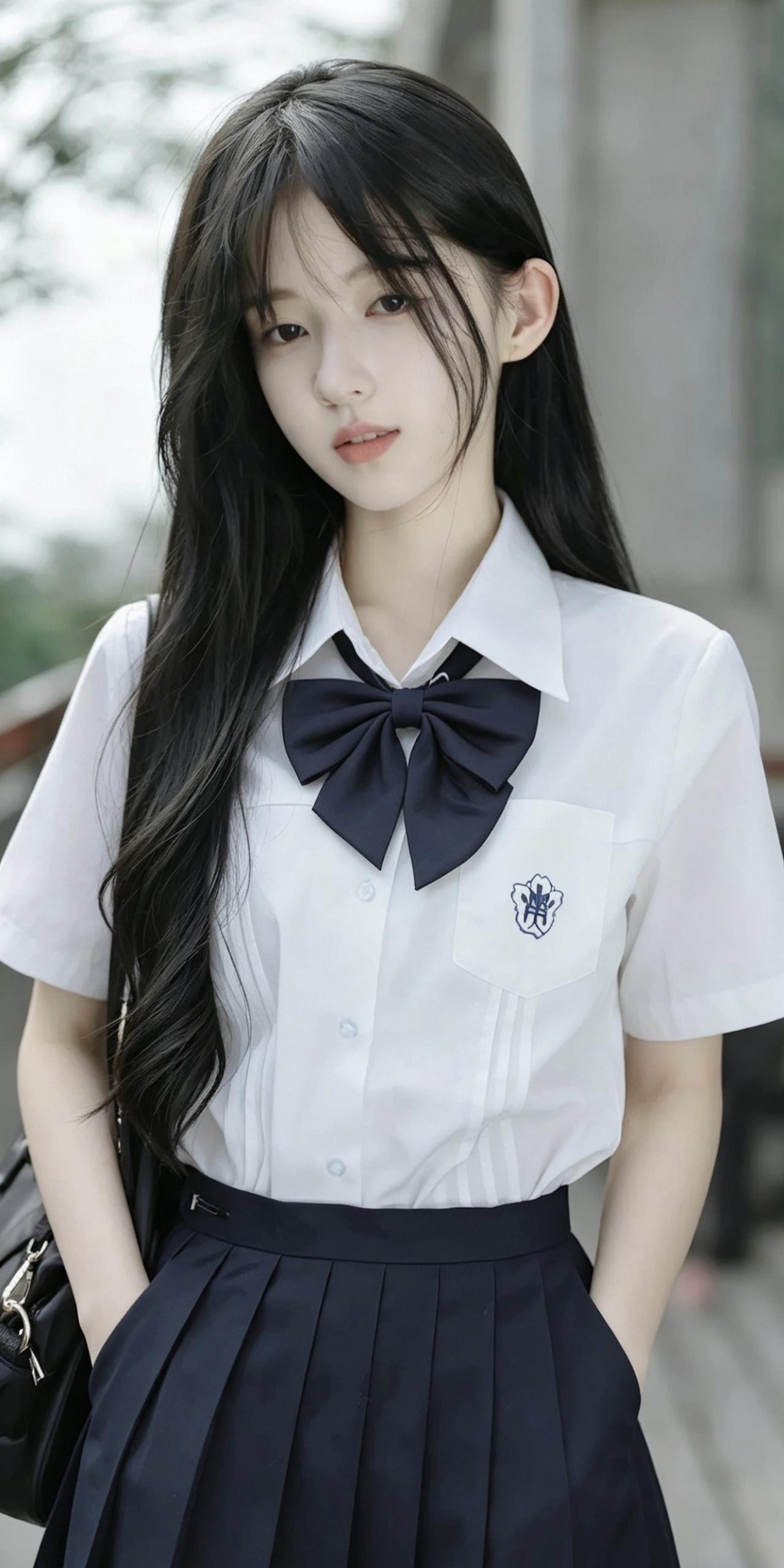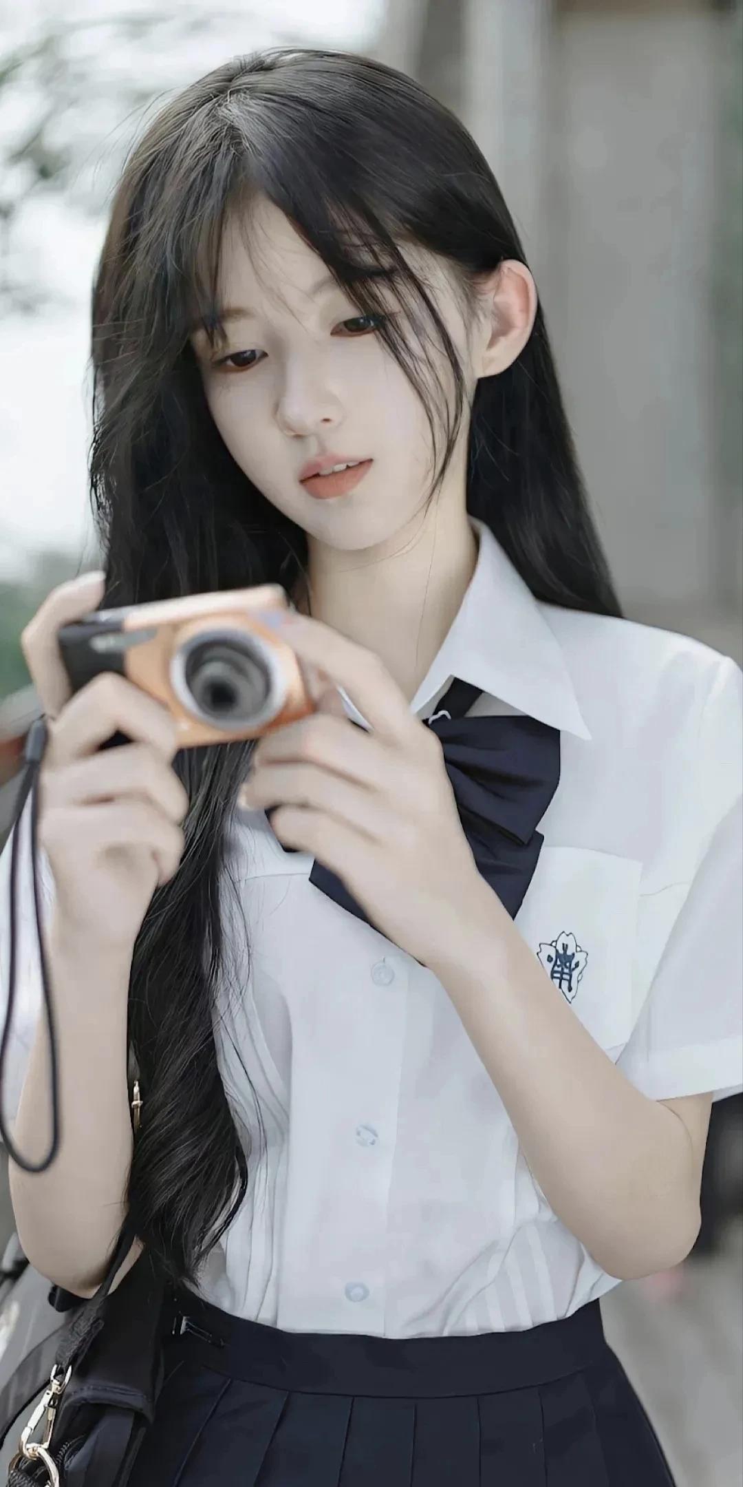长发配上这套制服,氛围感直接拉满,干净又纯粹,这大概就是青春最美好的样子吧。