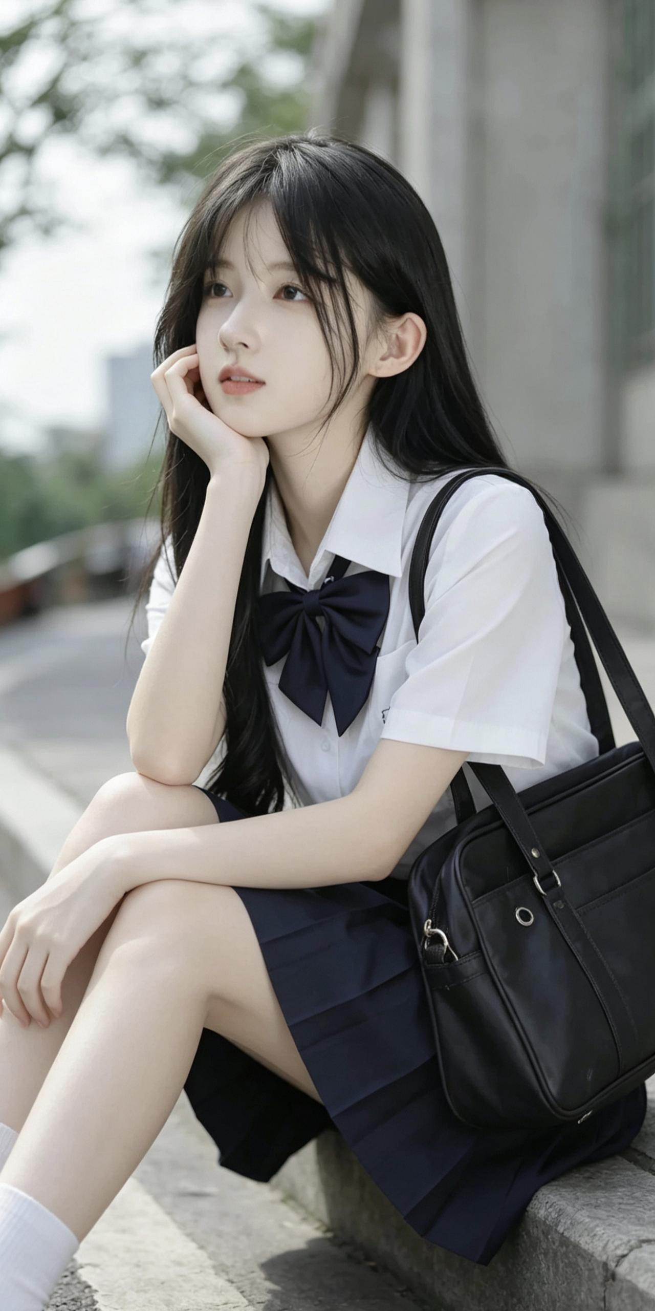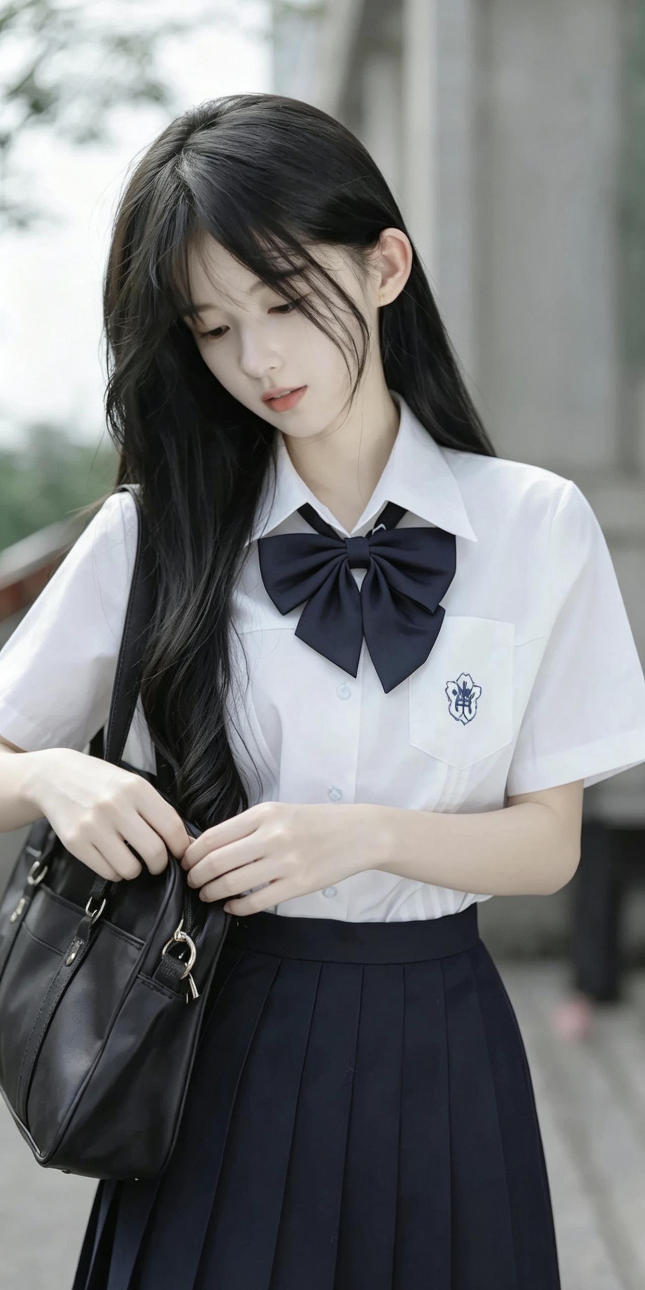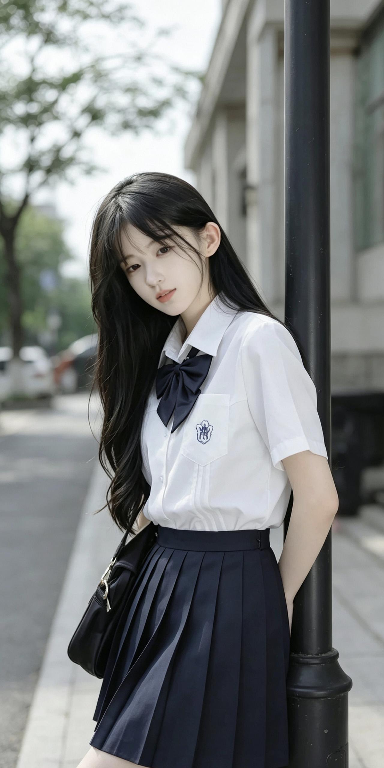长发配上这套制服,氛围感直接拉满,干净又纯粹,这大概就是青春最美好的样子吧。