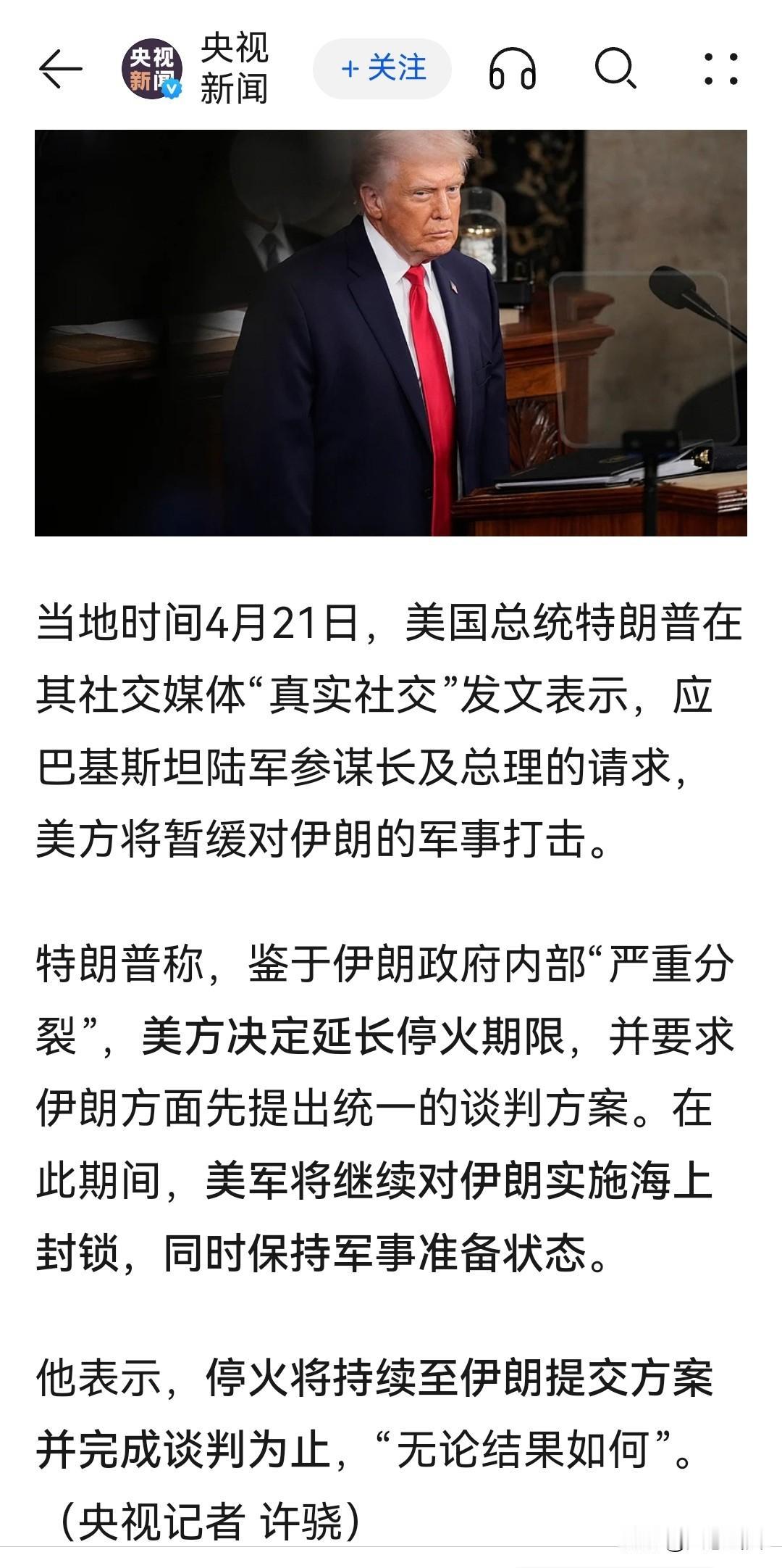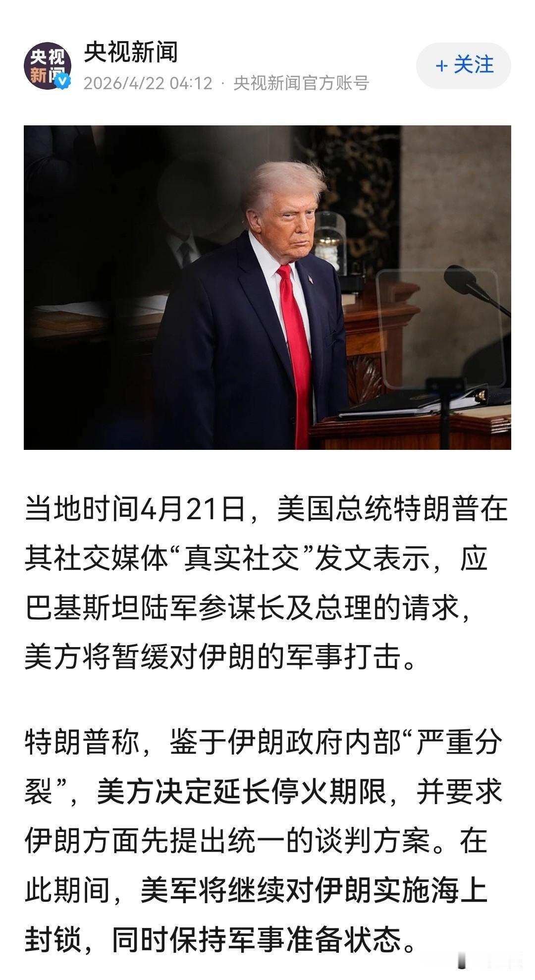 综合媒体最新报道,4月22日,美伊暂时停火期限到来之前,特朗普宣布延长停火期限。