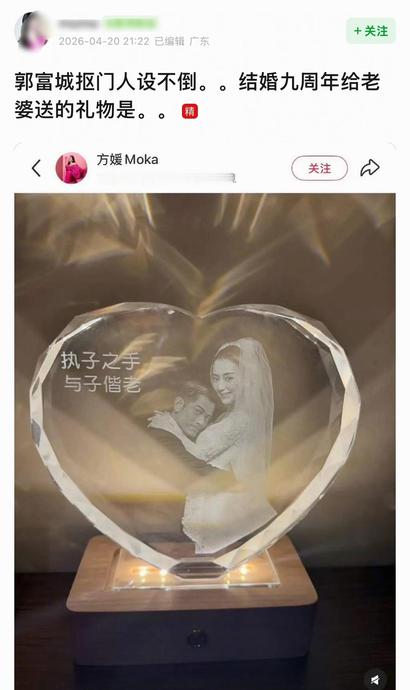方媛晒结婚九周年纪念照片,评论区说郭富城太抠,送个水晶摆件…结果方媛说是她送郭富城的,评论区改口说老头好糊弄了哈哈哈哈