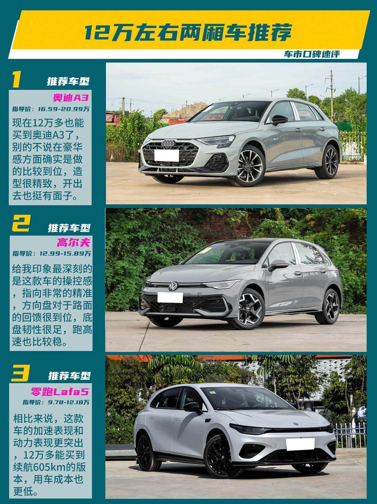 现在市面上的两厢车选择性不如以前多了,但是依然有几款车可以供大家选择,今天我们来聊一聊。我给大家推荐的是奥迪A3、高尔夫、零跑Lafa5。