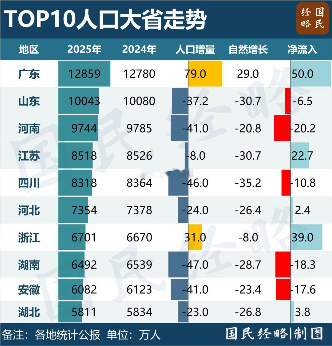 全国人口最多的10个省:1亿人口俱乐部,仅剩广东和山东。