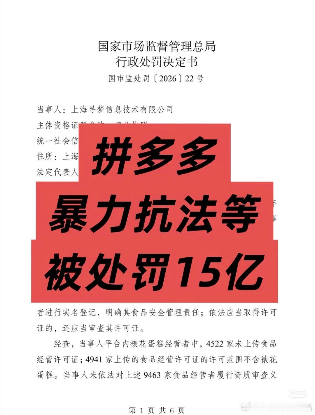 拼多多暴力抗法4月17日,市监总局对拼多多、美团、京东、抖音、淘宝、天猫、饿了么,开出35.97亿天价罚单,同时处罚法人+食安总监合计近2000万,创下我国食品安全领域处罚新高!核心问题:严查"幽灵外卖"。