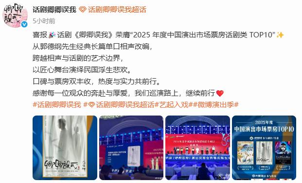秦霄贤主演话剧,拿下年度票房TOP10,老秦事业逐渐重回巅峰!德云社话剧《卿卿误我》官方发布消息,《卿卿误我》拿下2025年度中国演出市场票房话剧类TOP10。这个成绩的获得,与《卿卿误我》的口号遥相呼应。卿卿误我,一定大火。当然,这份成绩不仅肯定了作品的优秀,也肯定了秦霄贤、朱美吉、杨九郎等演员的付出。就像网友说的那样,郭德纲慧眼识珠,秦霄贤不负所望,只要给机会,秦霄贤就能抓住,就能给你带来出色的表现。