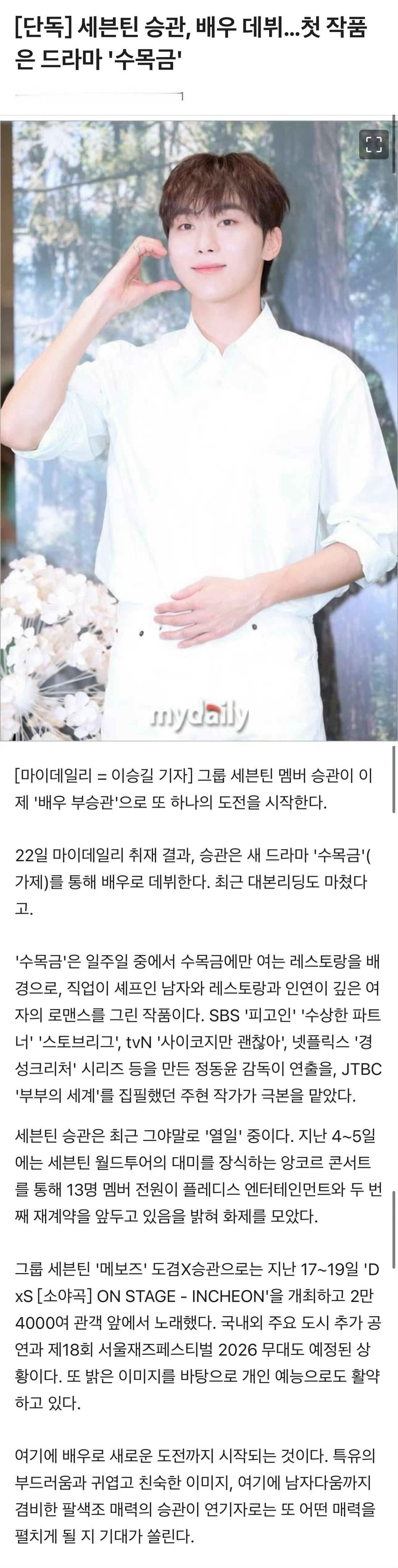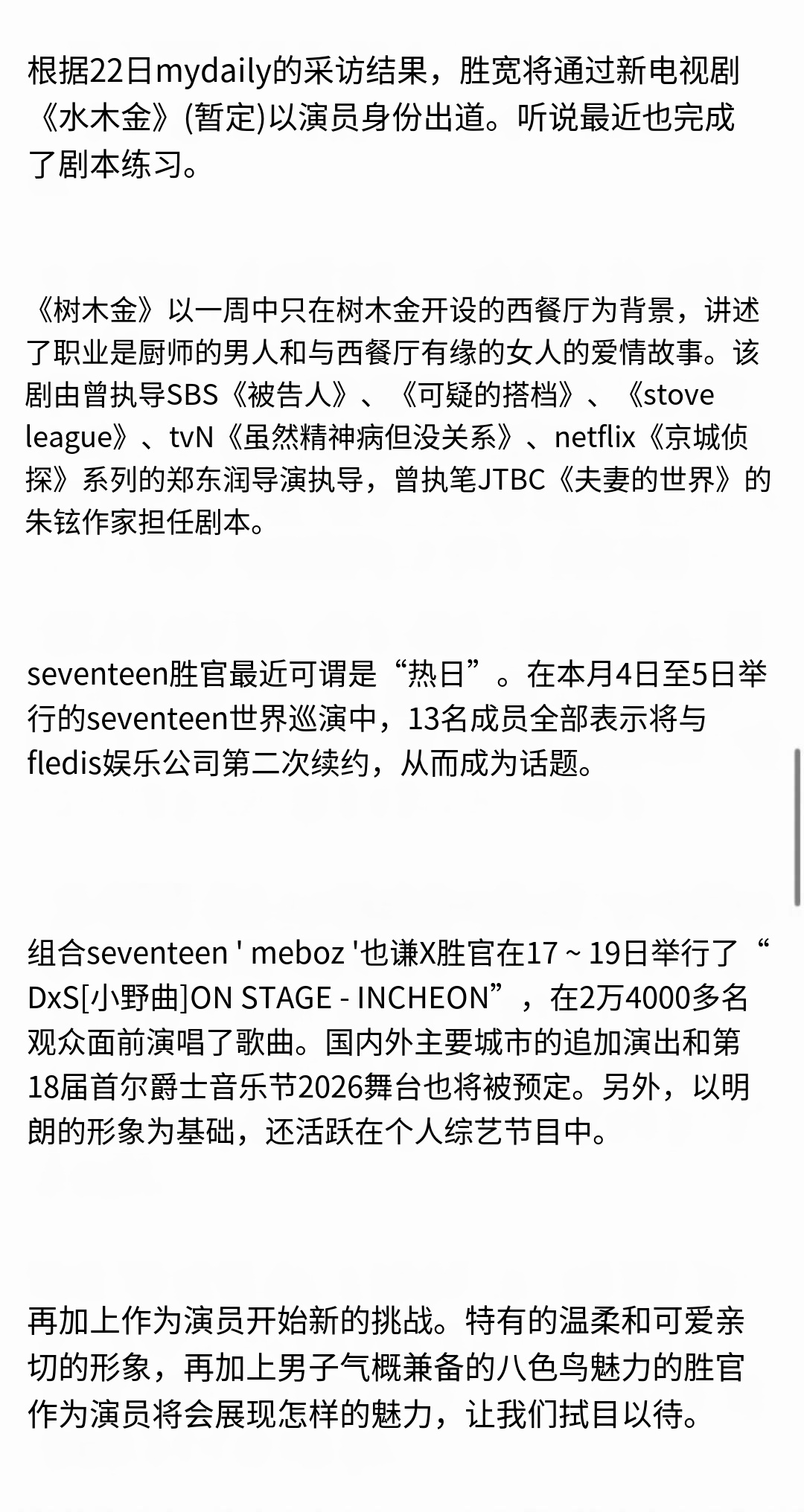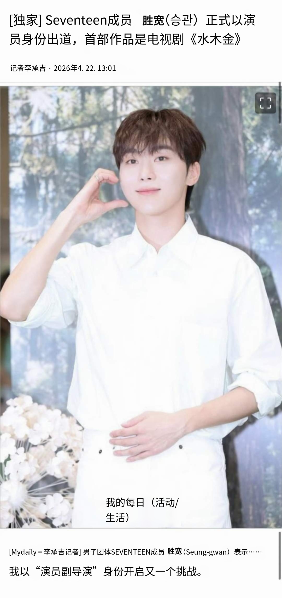 OMG!SEVENTEEN夫胜宽将以演员身份出道,首部作品是电视剧《水木金》,目前已完成了剧本阅读所以前几天演唱会上的女装短片其实是演员出道前的练习吗哈哈哈哈夫胜宽将演员出道SEVENTEEN夫胜宽将以演员身份出道