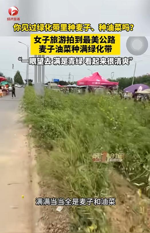 [熊猫]河南安阳一女子走在路上,无意间被路边的绿化带吸引——本该种花草的地方,竟齐刷刷长出了油菜和麦子。她表示,庄稼视野开阔,行车走路都不挡视线,走在旁边让人感觉特别轻松自在。