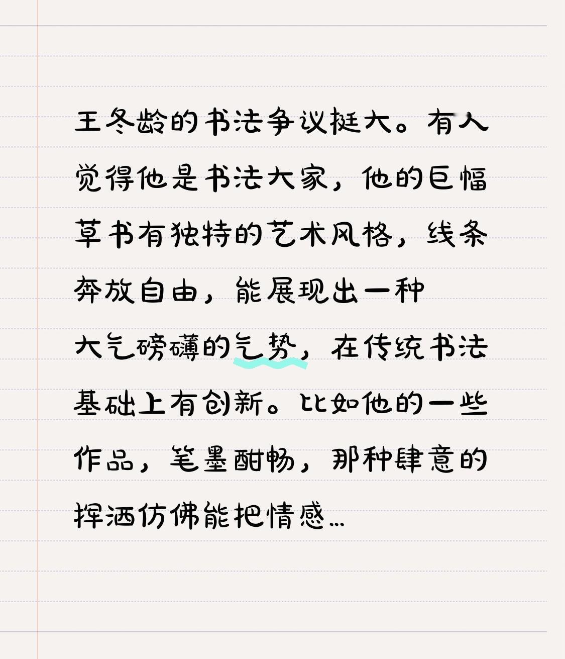 王冬龄的书法争议挺大。有人觉得他是书法大家,他的巨幅草书有独特的艺术风格,线条奔放自由,能展现出一种大气磅礴的气势,在传统书法基础上有创新。比如他的一些作品,笔墨酣畅,那种肆意的挥洒仿佛能把情感都倾注其中。