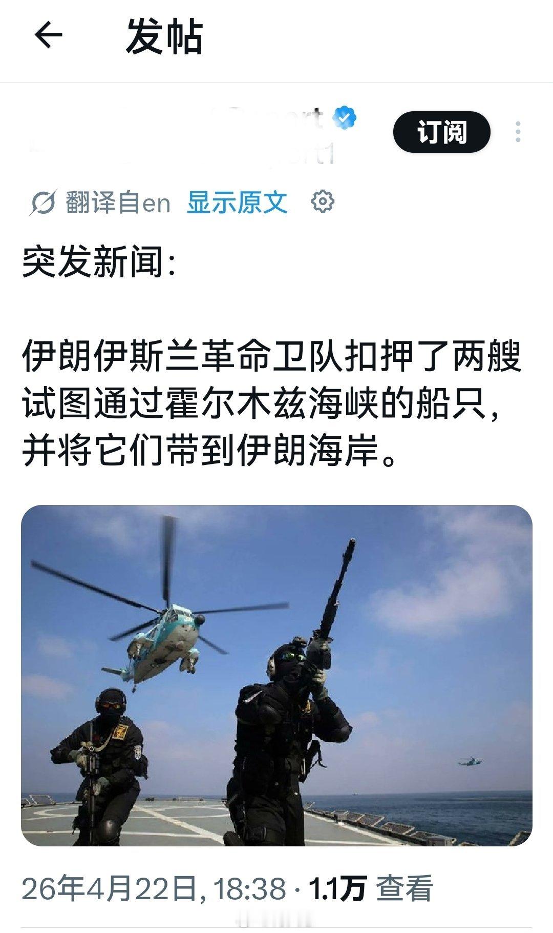突发新闻:伊朗伊斯兰革命卫队海军以涉嫌航行违规为由扣押了两艘船只。目前,两艘船只