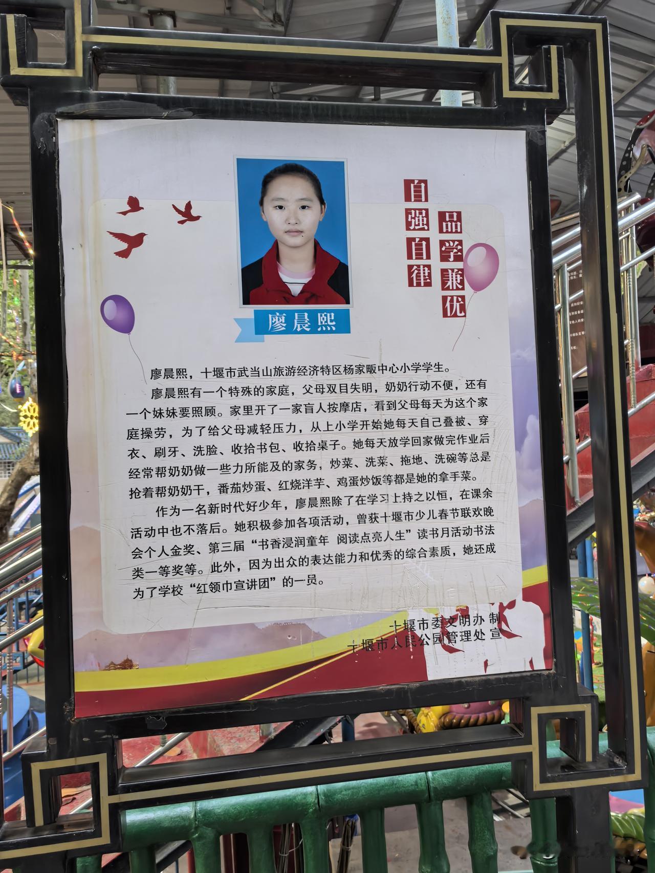 由于当天是周六,来公园里游玩的人还是不少。在公园里走动时,道路一侧立的一块人物宣传牌引起了小编的关注。这是一块品学兼优自律自立的学生的故事。看文字,这是一个家庭多难的女孩子。这个女孩很自律,很自强。看完故事,让身为外地人的小编深有感动。平凡而不屈的小人物,是我们更应该关注和学习的。随手拍,分享图片 分享每日的感悟