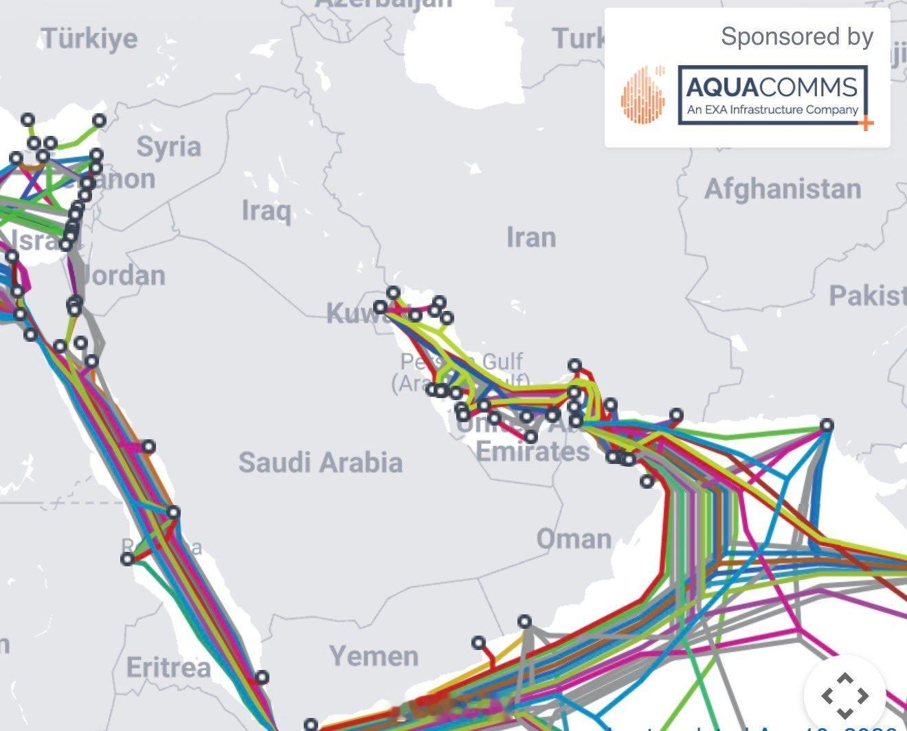 数十条主要海底线缆光纤电缆穿过波斯湾和霍尔木兹海峡(根据分析,广义区域内至少有17个系统)。