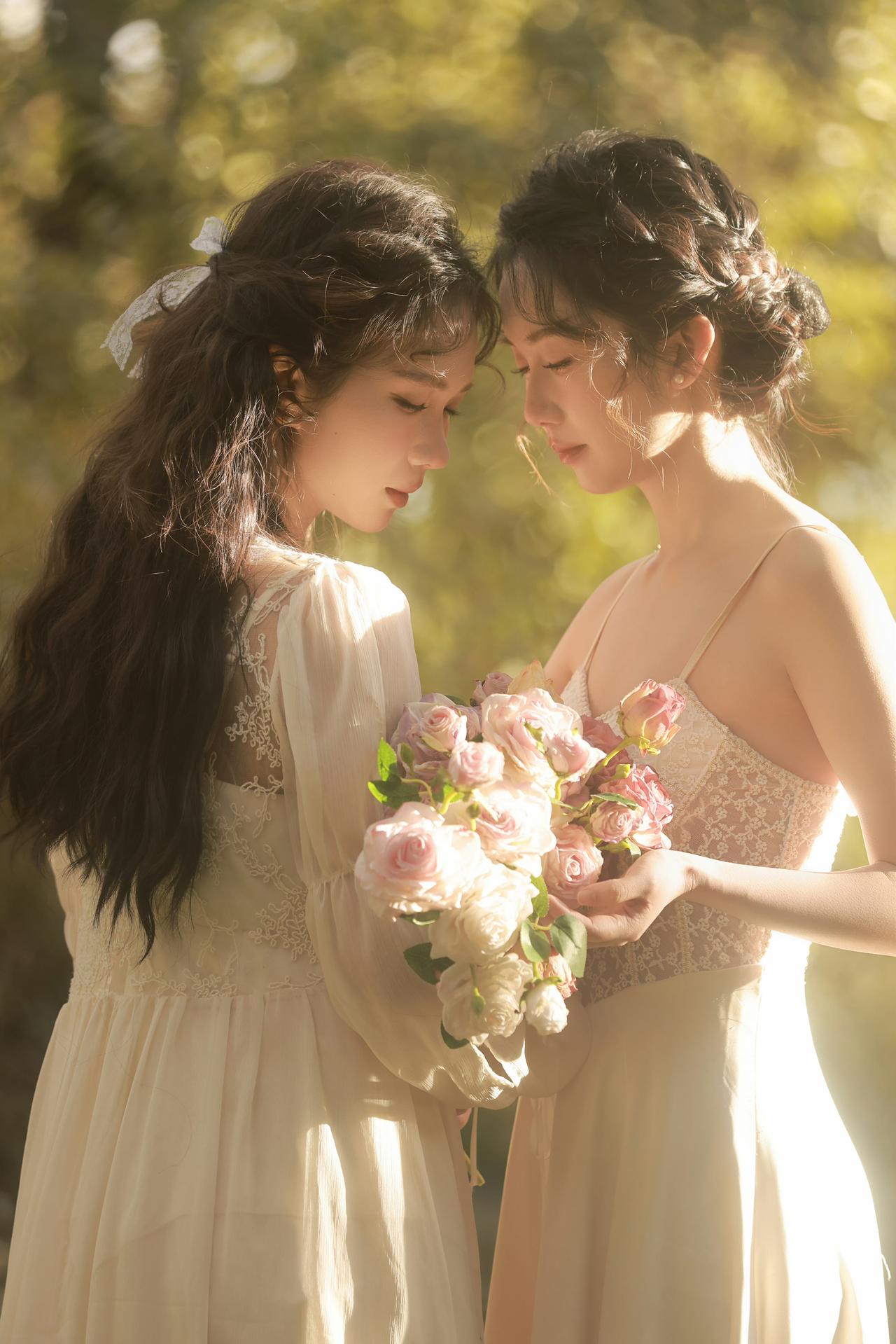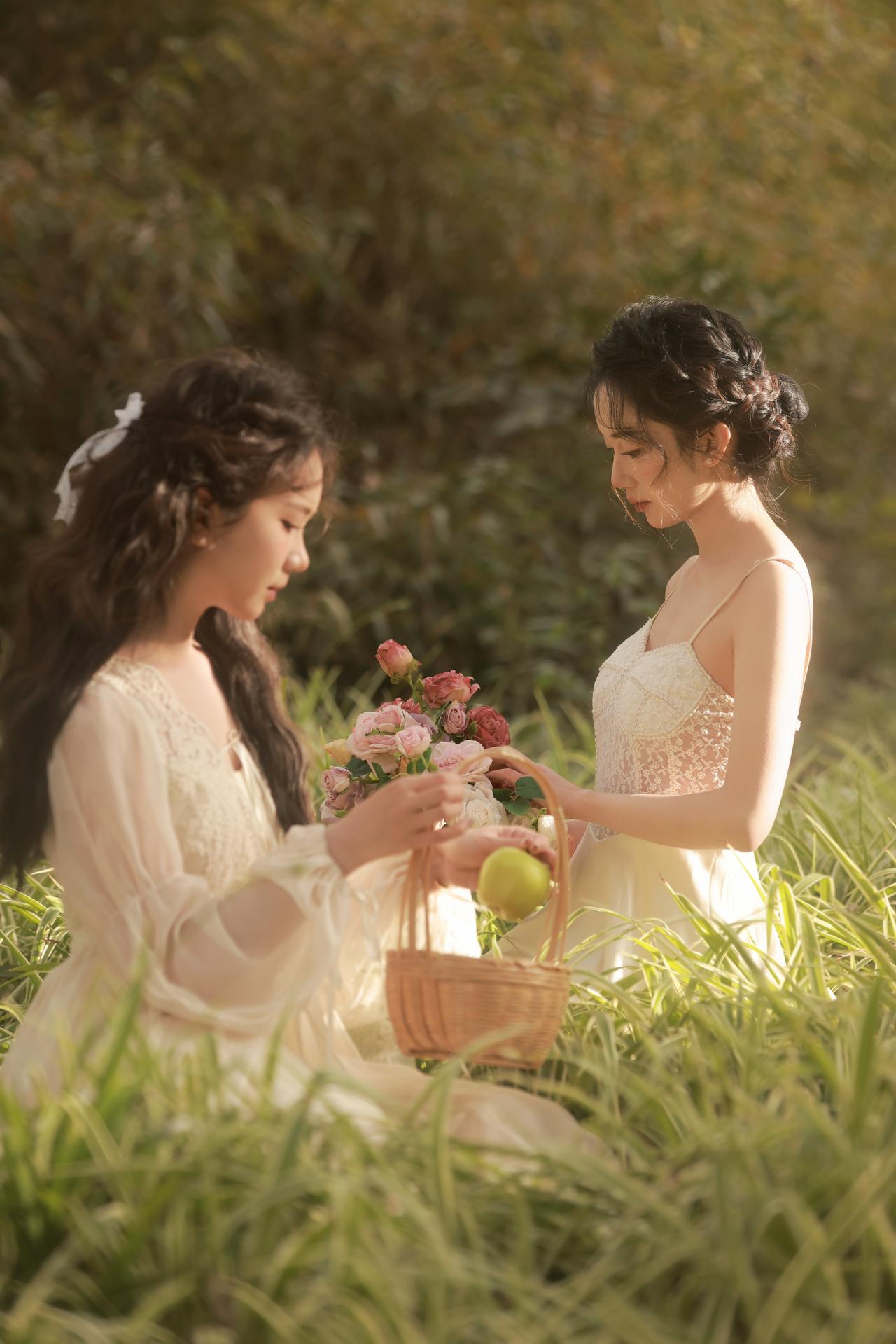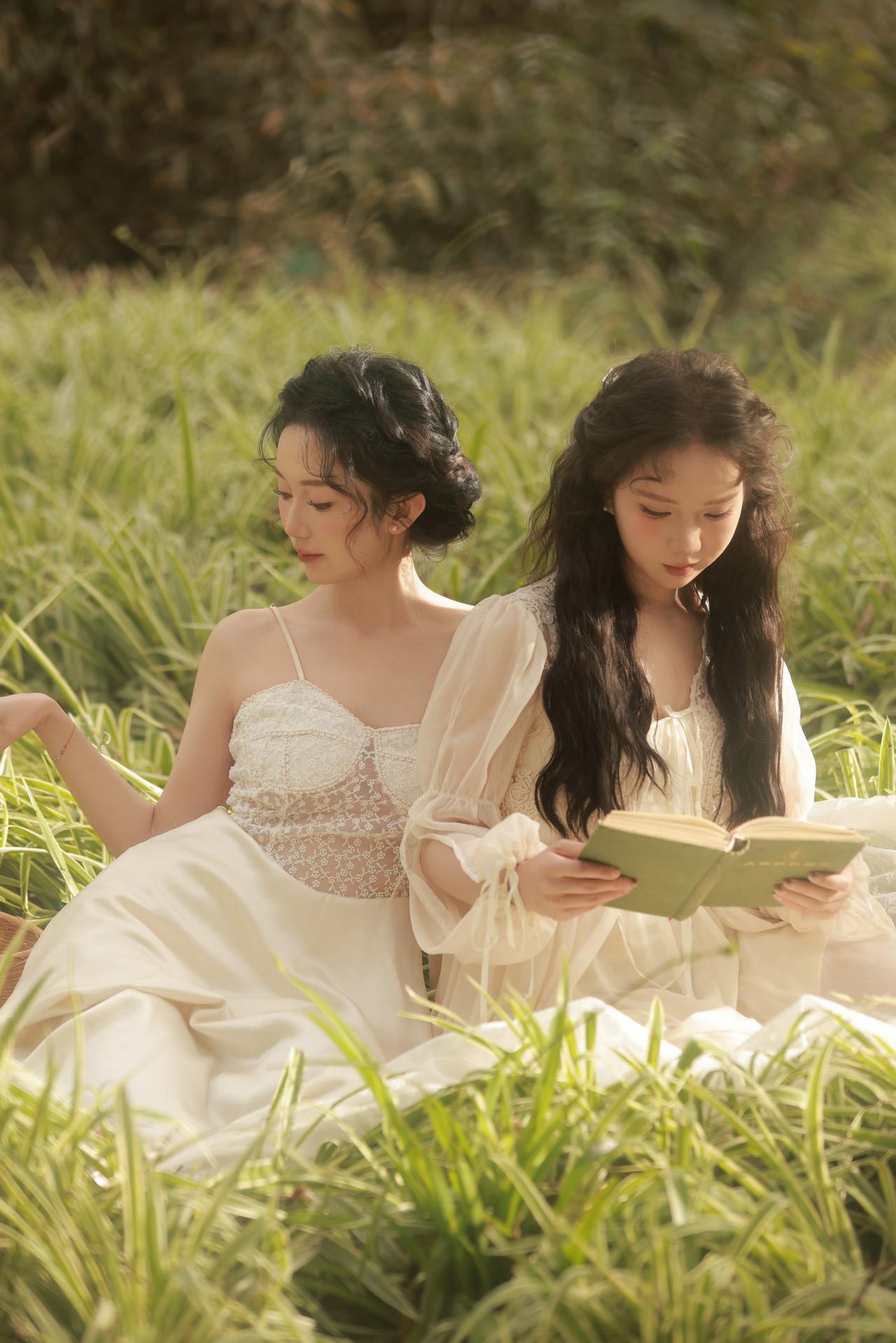 裙摆轻扬,花香漫溢,书页藏着细碎温柔,牵手走过满是柔光的时光。