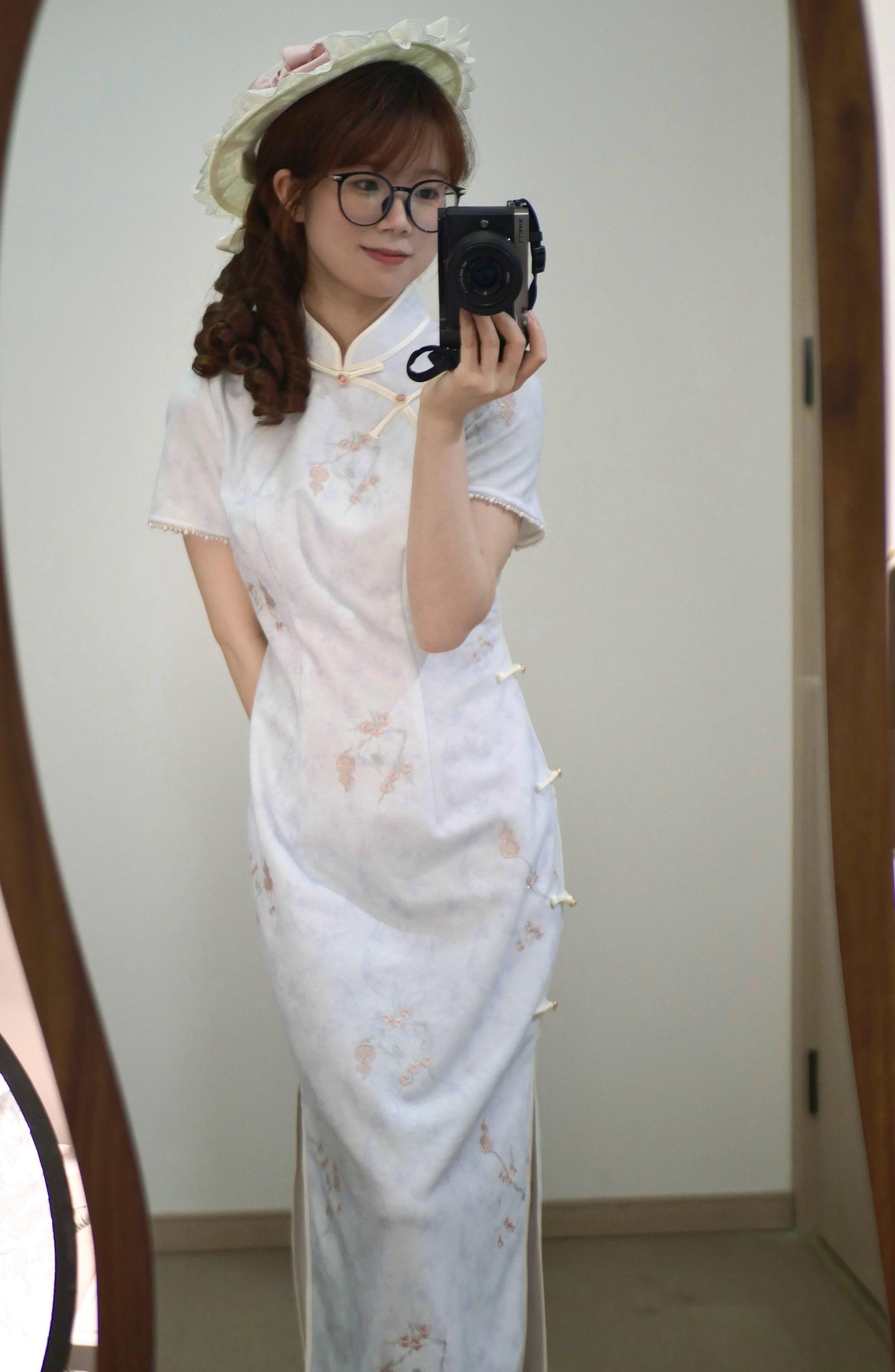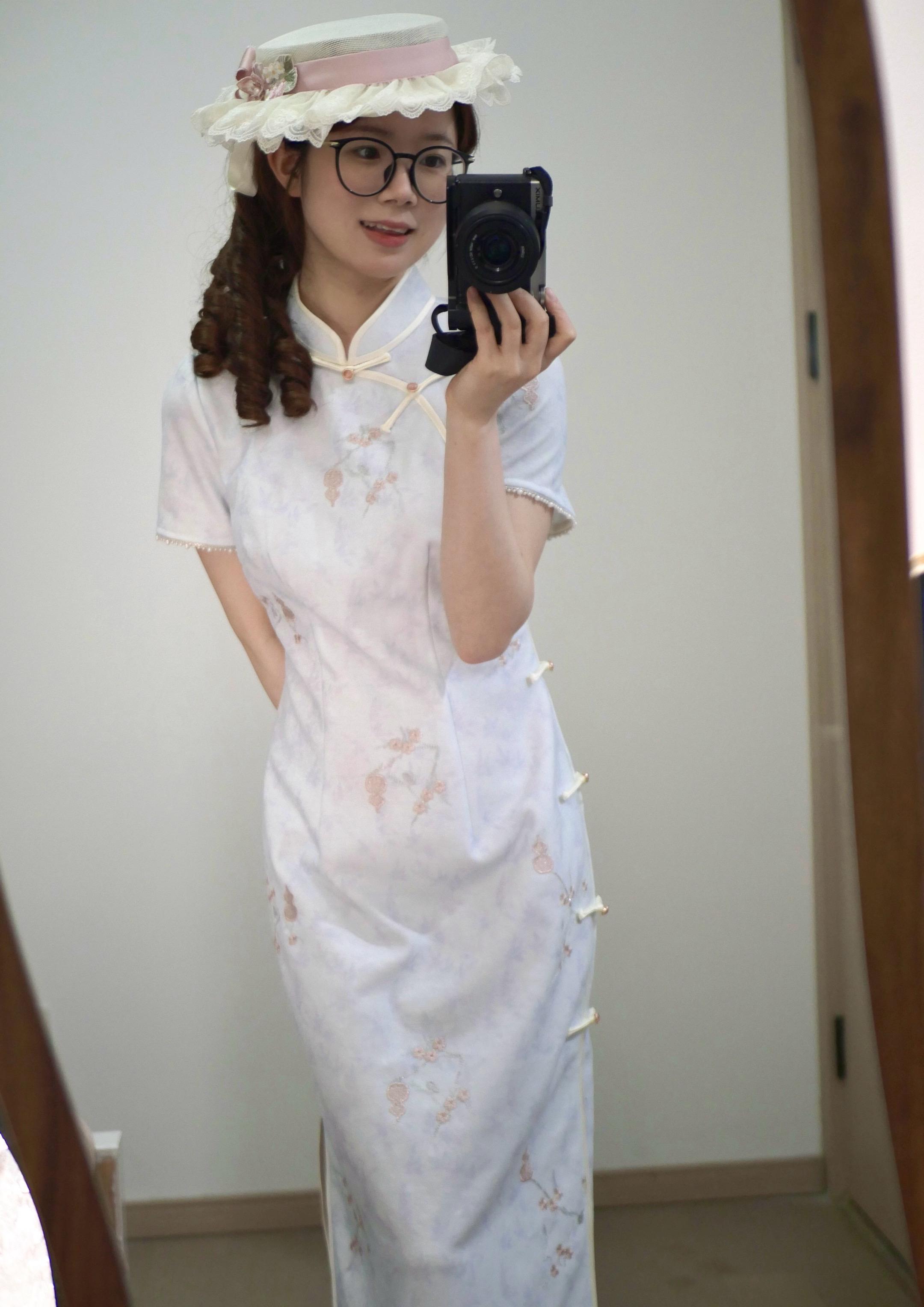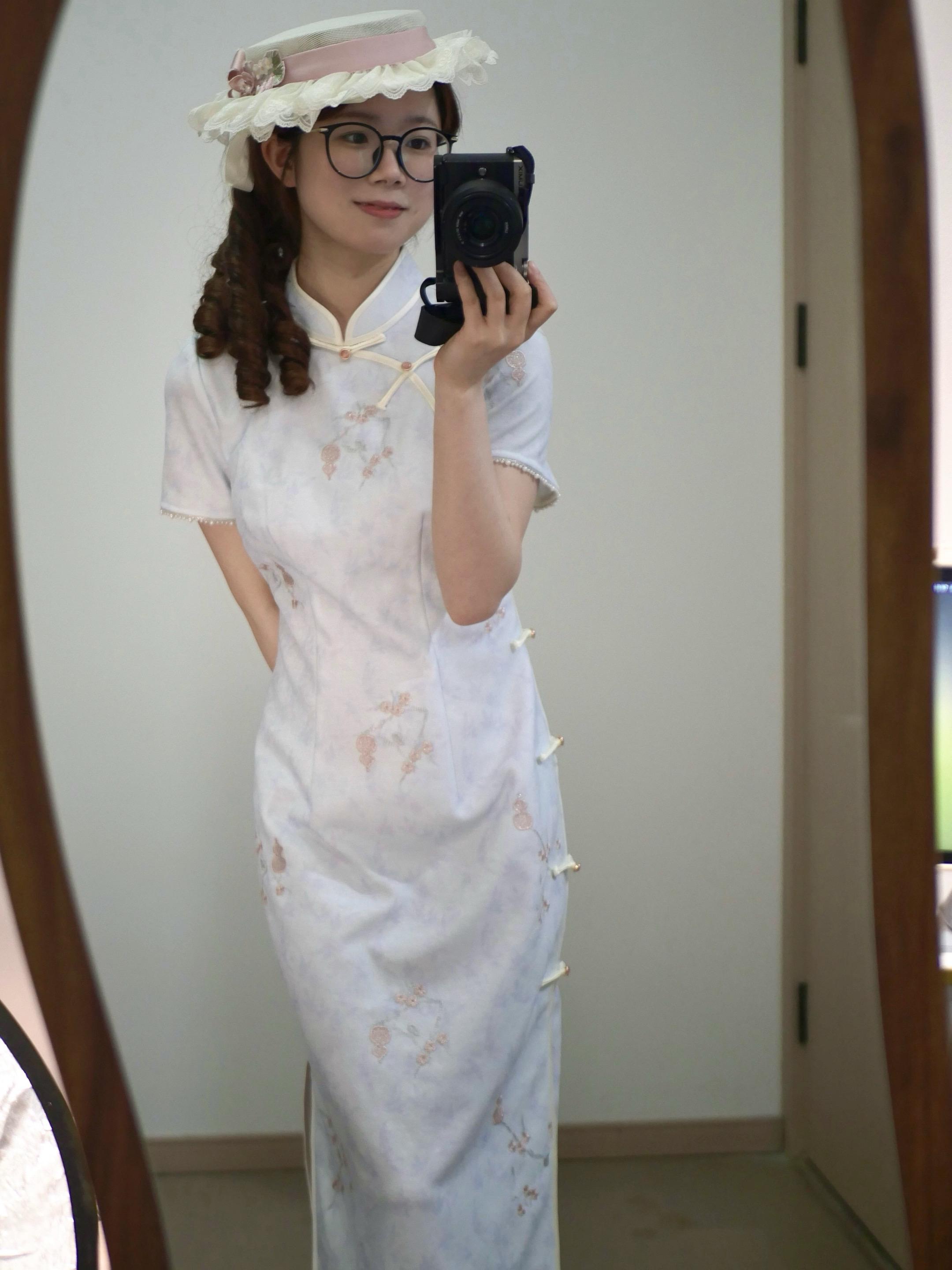 平礼帽和旗袍真是百搭不腻!是一件有粉色的花花点缀的浅蓝色旗袍^^颜色搭配特别和谐耶(本人看到蓝粉色就走不动道了૮⁔. ̫ .⁔ა